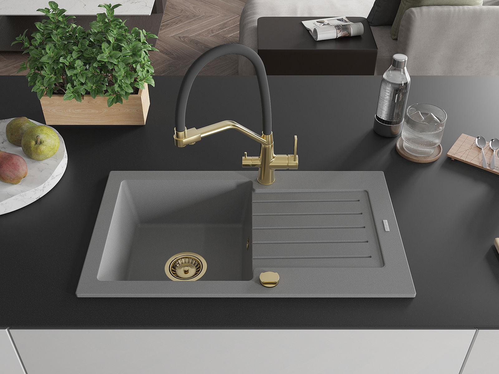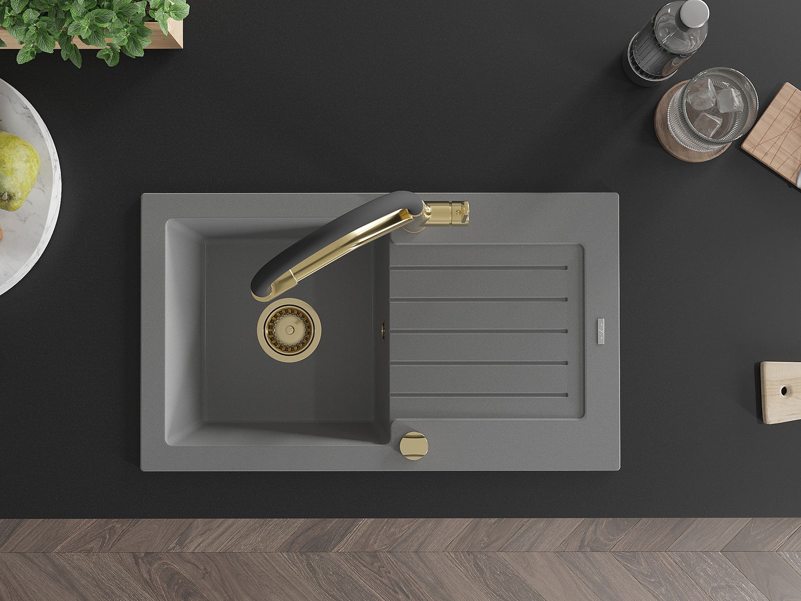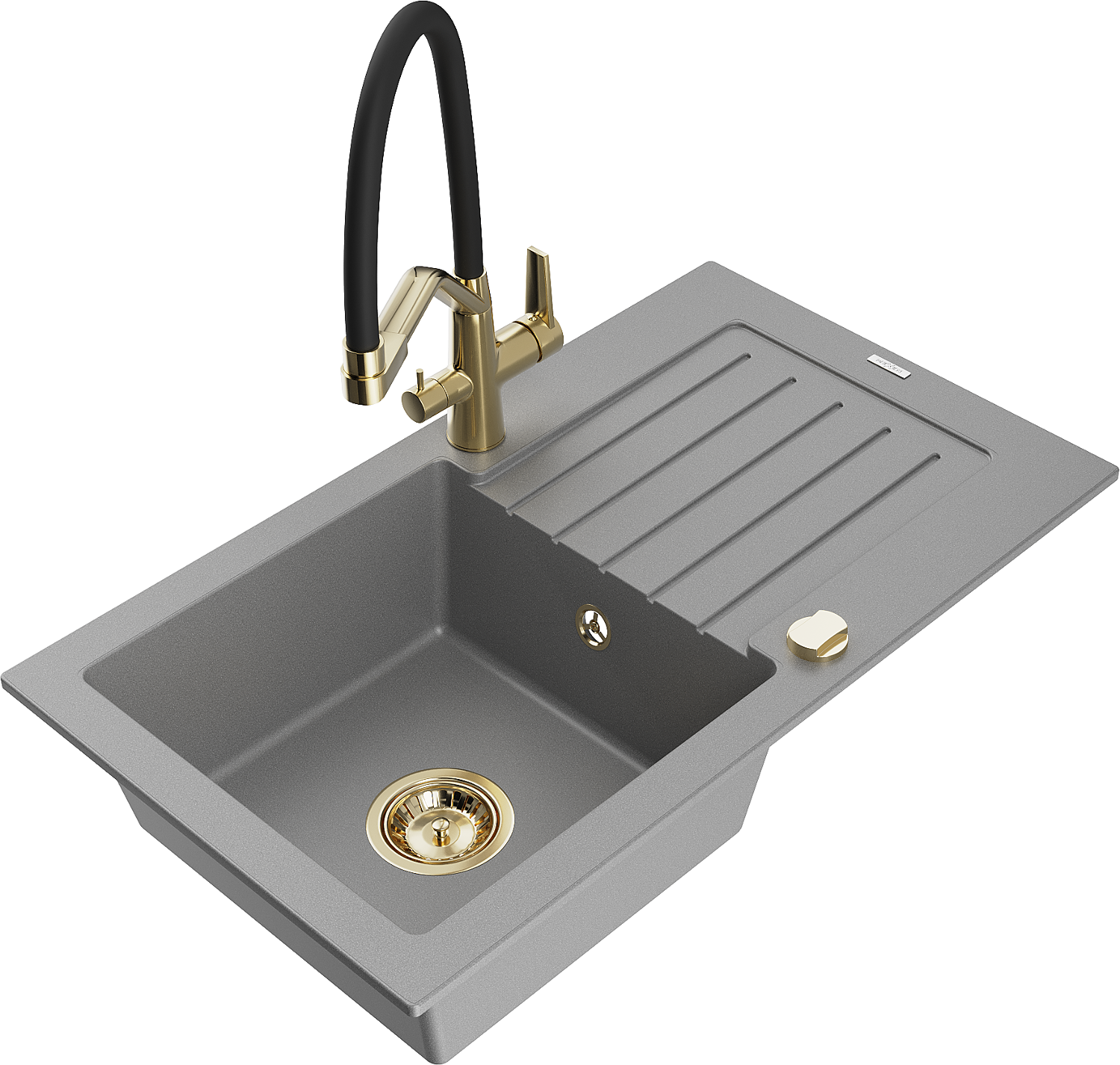 Mexen Pablo granitový dřez 1-komorový s odkapávačem a kuchyňskou baterií Duo, šedý - 6510-71-671701-57-G