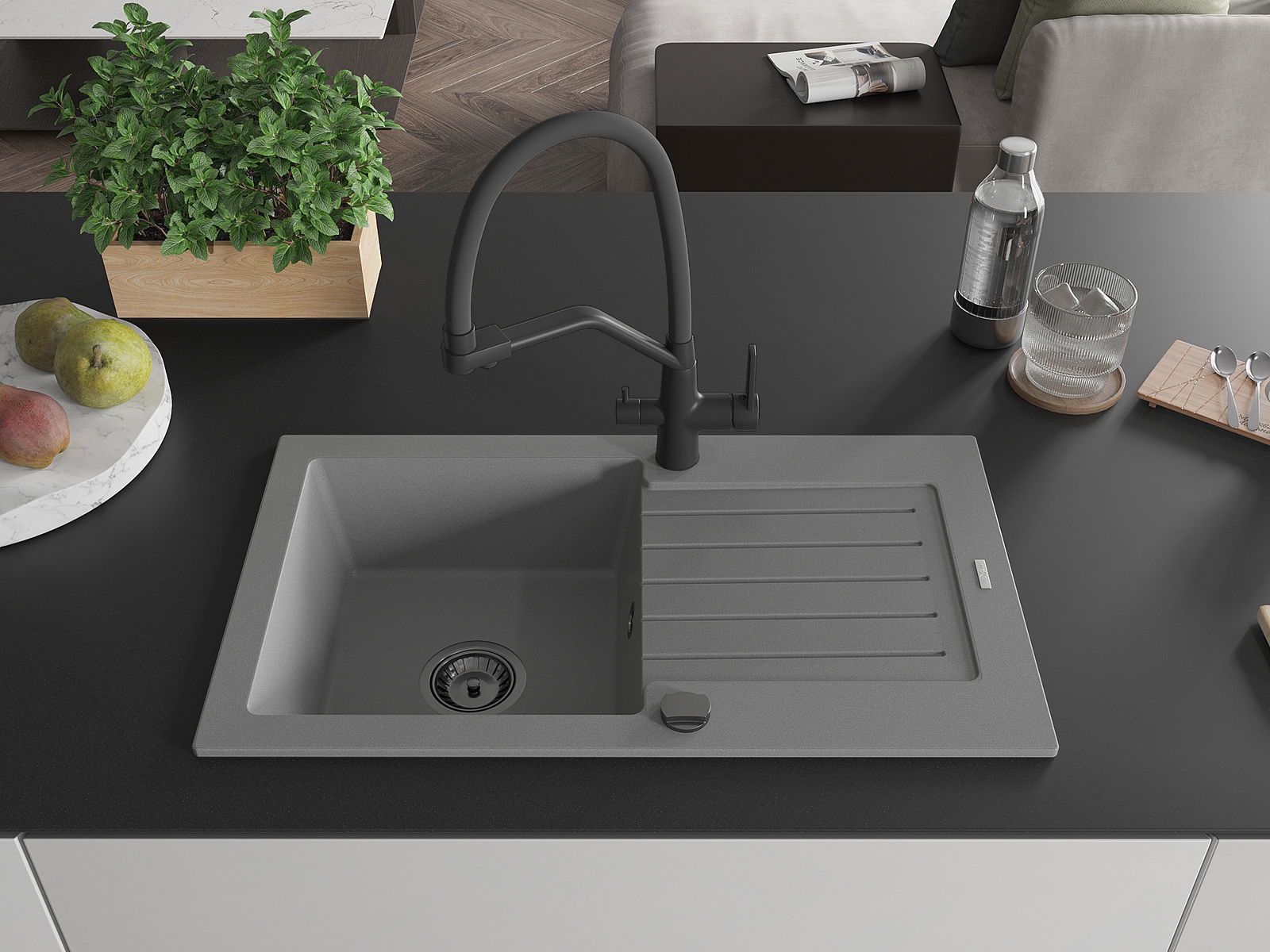 Mexen Pablo granitový dřez s 1 komorou, odkapávačem a kuchyňskou baterií Duo, šedý - 6510-71-671701-70-B