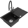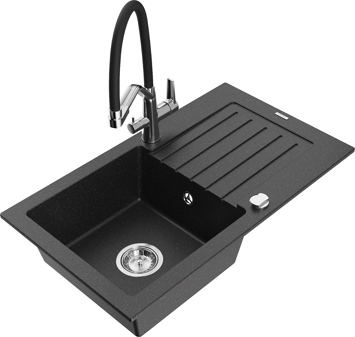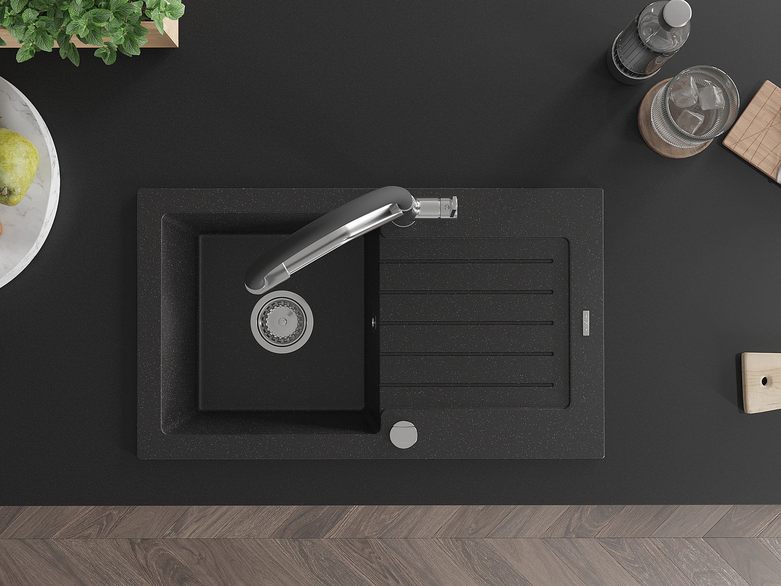 Mexen Pablo granitový dřez 1-komorový s odkapávačem a kuchyňskou baterií Duo, černý/stříbrný metalický - 6510-73-671701-07