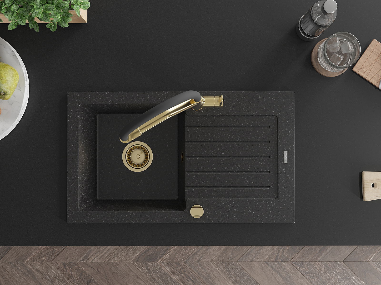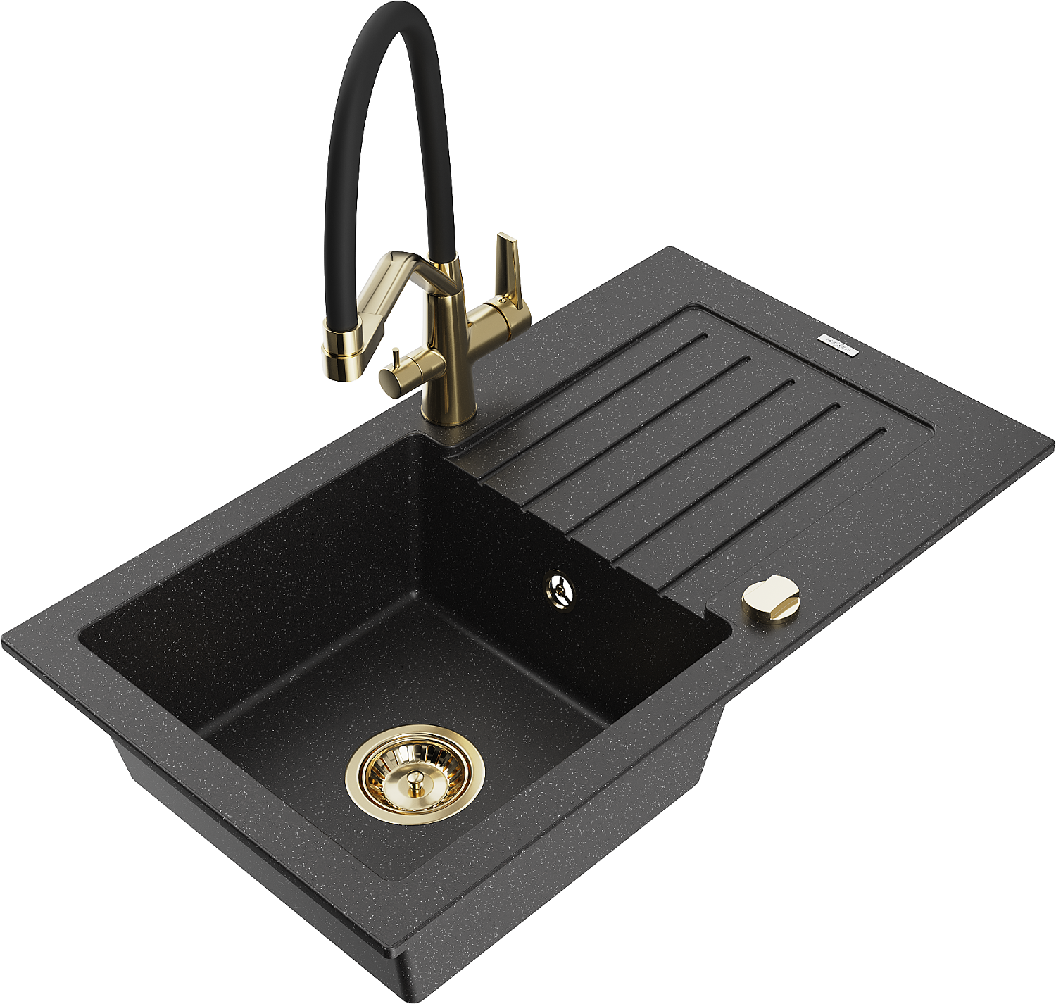 Mexen Pablo granitový dřez jednokomorový s odkapávačem a kuchyňskou baterií Duo, černý/stříbrný metalik - 6510-73-671701-57-G