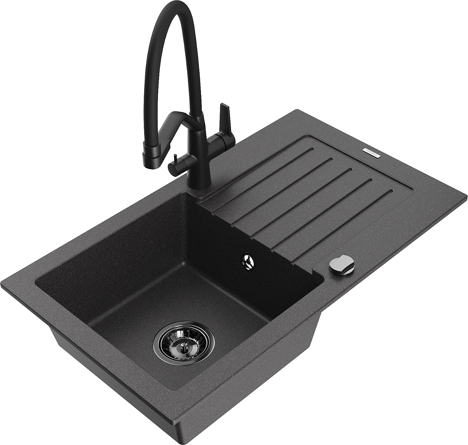 Mexen Pablo granitový dřez s 1 komorou, odkapávačem a kuchyňskou baterií Duo, černý kropenatý - 6510-76-671701-70-B