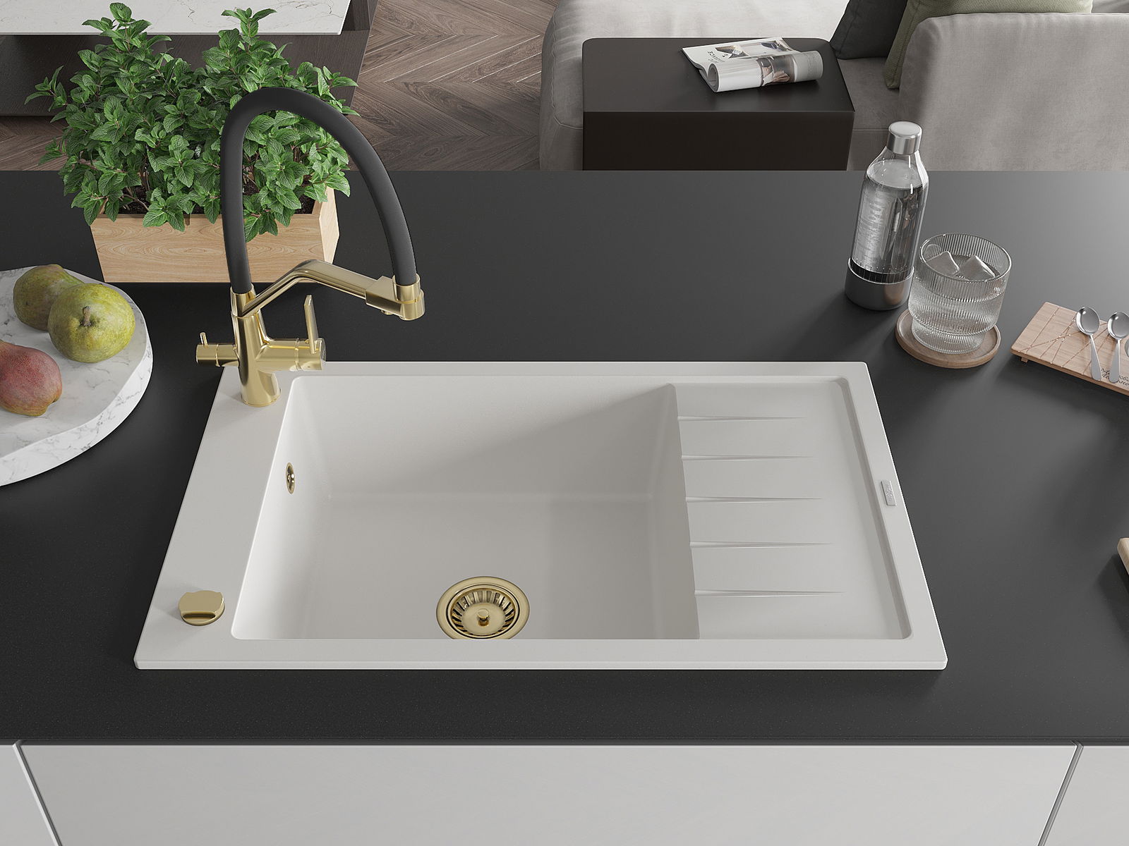 Povrch dřezu je odolný proti skvrnám a zabarvení, což usnadňuje jeho čištění a zachovává jeho barvu po dlouhou dobu používání. Estetický a praktický doplněk každé kuchyně.