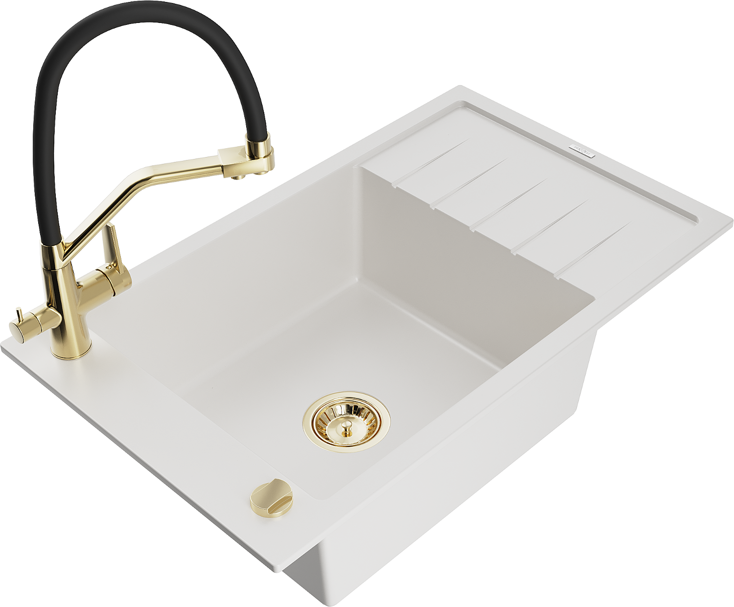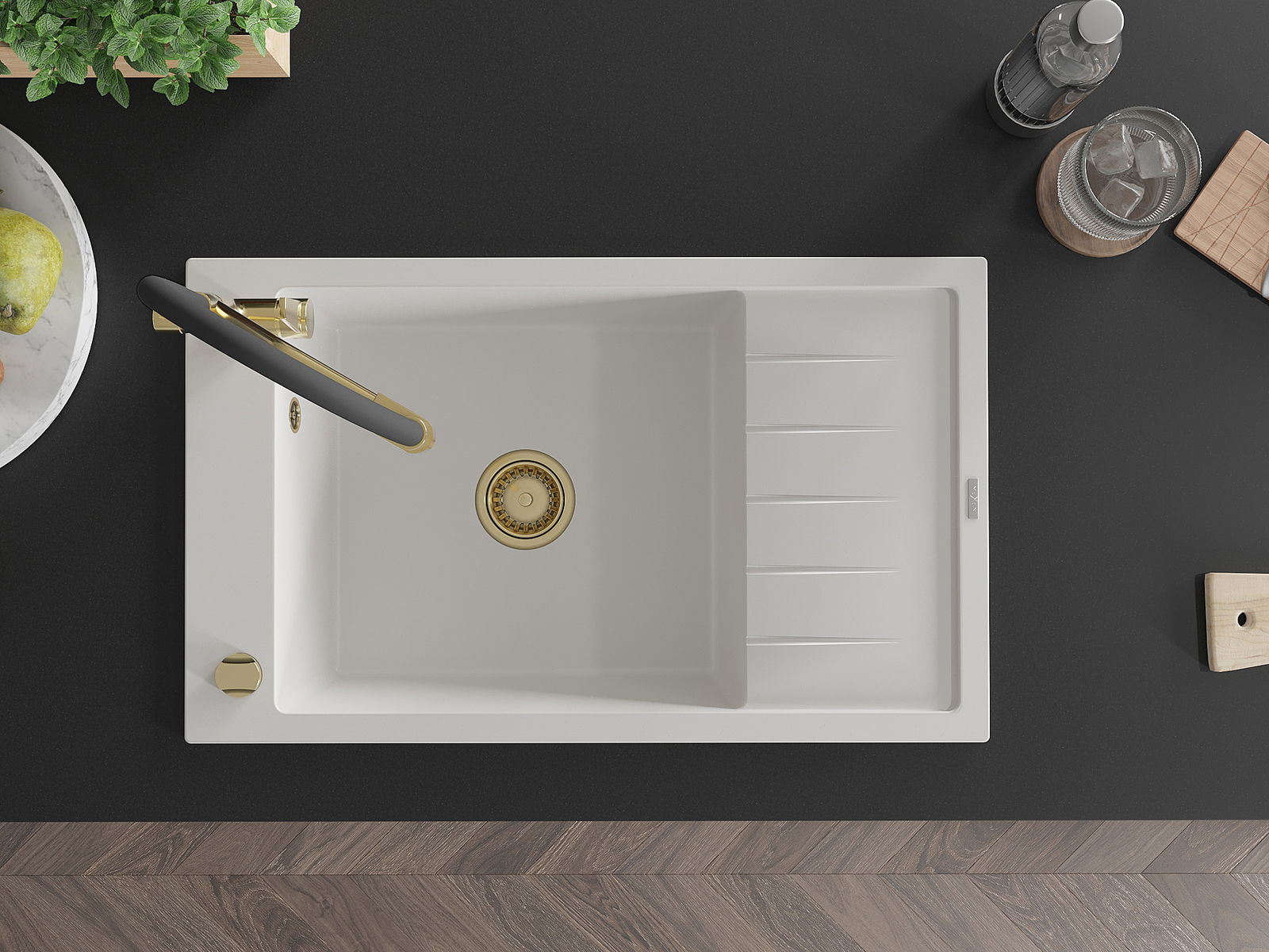 Mexen Elias granitový dřez s 1 komorou s odkapávačem a kuchyňskou baterií Duo, bílý - 6511-20-671701-57-G