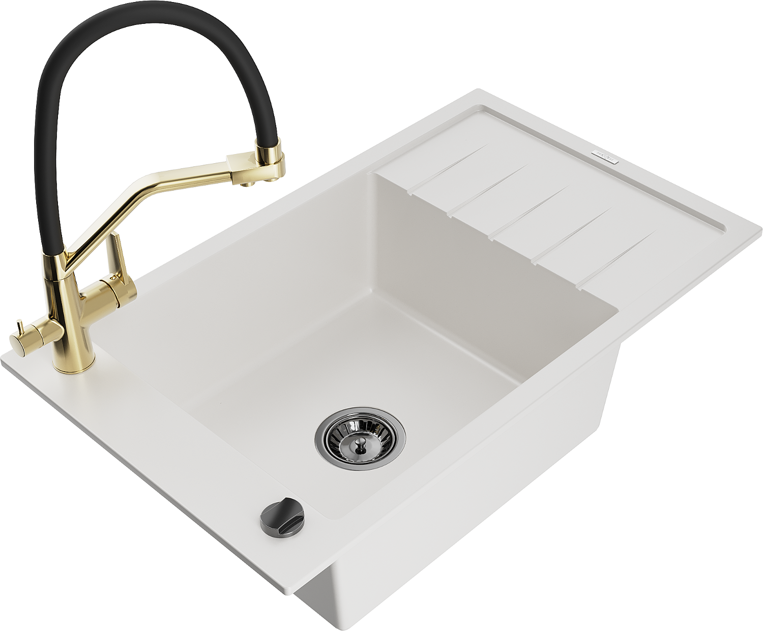 Mexen Elias granitový dřez 1-komorový s odkapávačem a kuchyňskou baterií Duo, bílý - 6511-20-671701-57-B