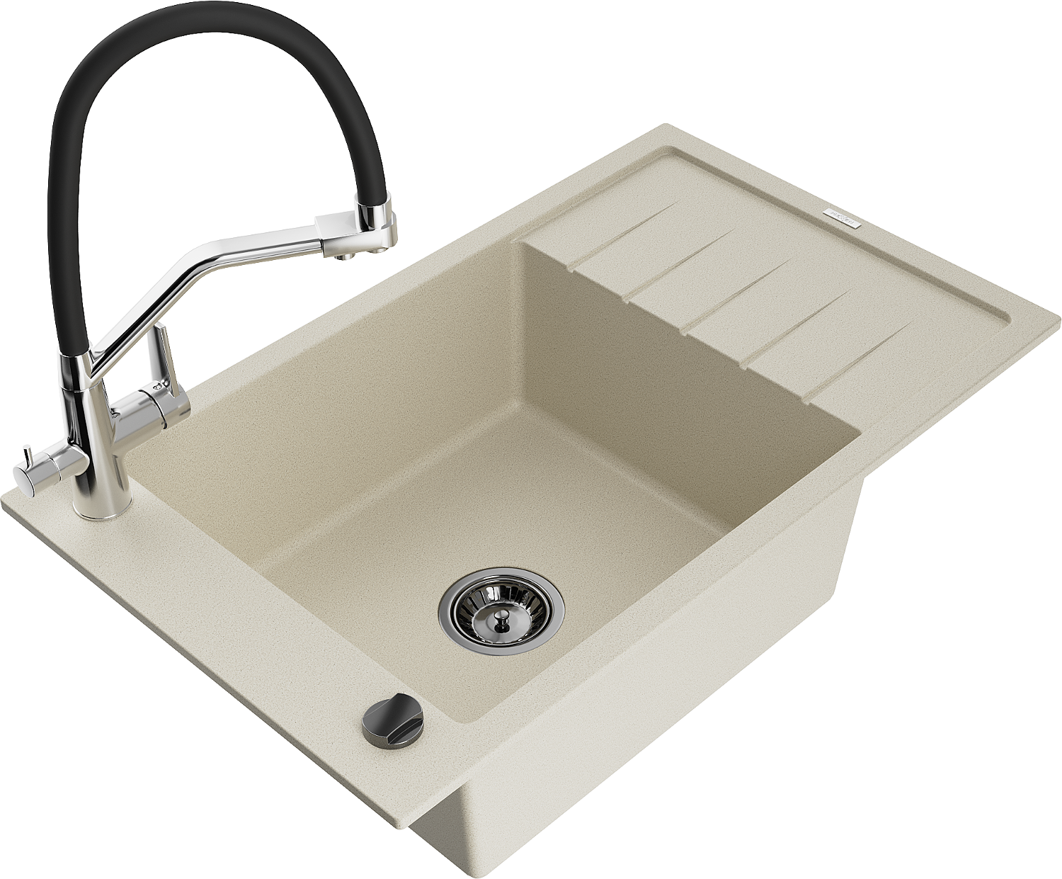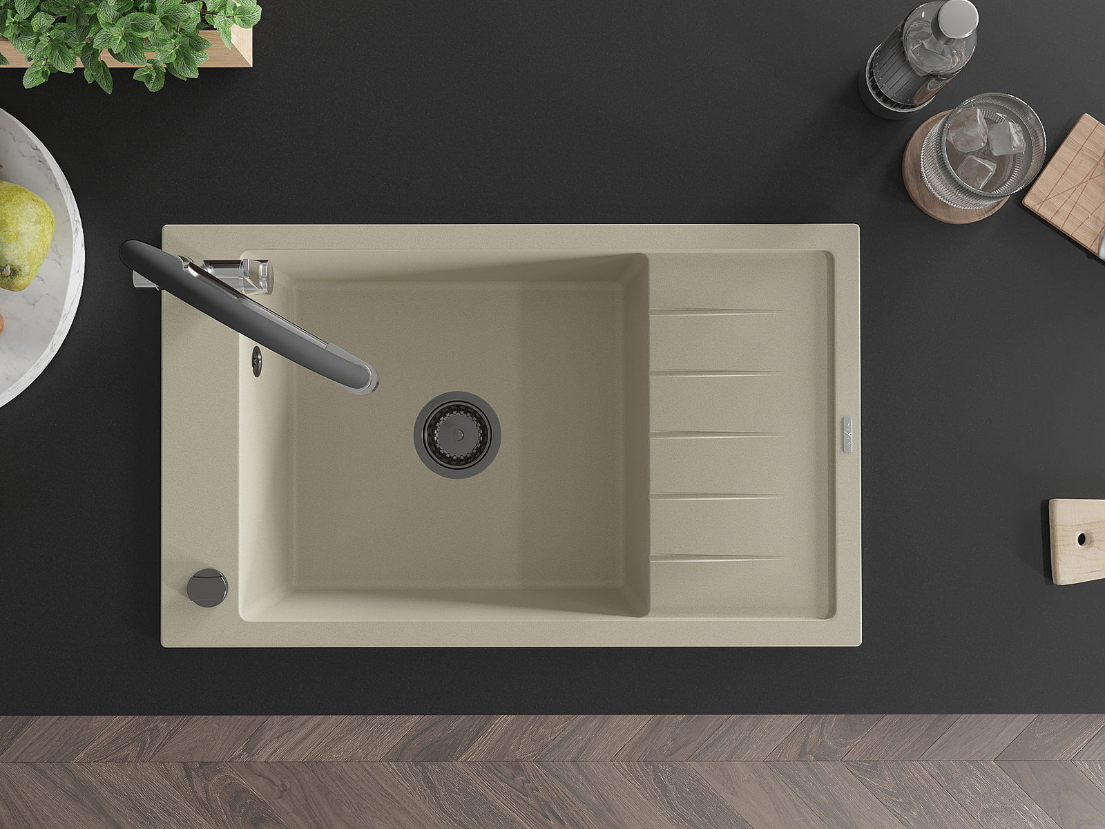 Mexen Elias granitový dřez 1-komorový s odkapávačem a kuchyňskou baterií Duo, béžový - 6511-69-671701-07-B
