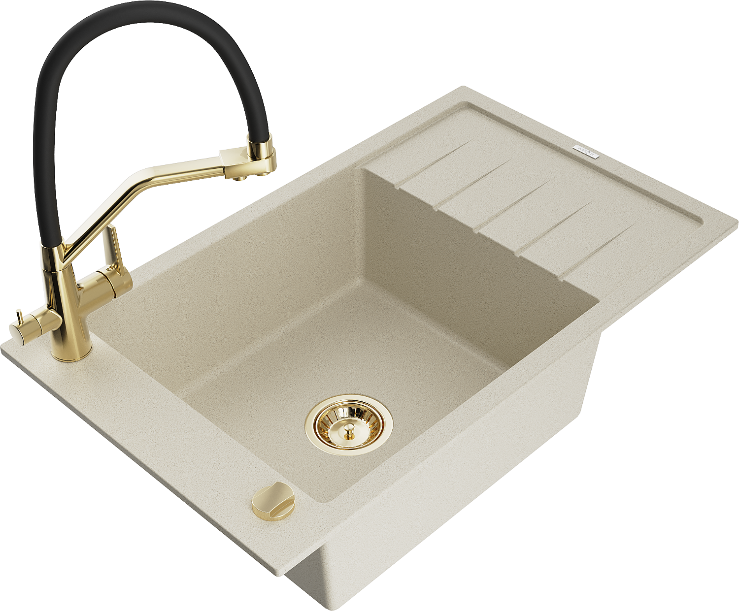 Mexen Elias granitový dřez 1-komorový s odkapávačem a kuchyňskou baterií Duo, béžový - 6511-69-671701-57-G