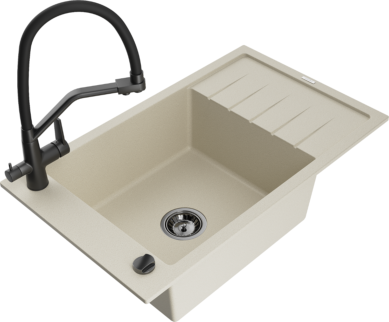 Mexen Elias granitový dřez s 1 komorou, odkapávačem a kuchyňskou baterií Duo, béžový - 6511-69-671701-70-B