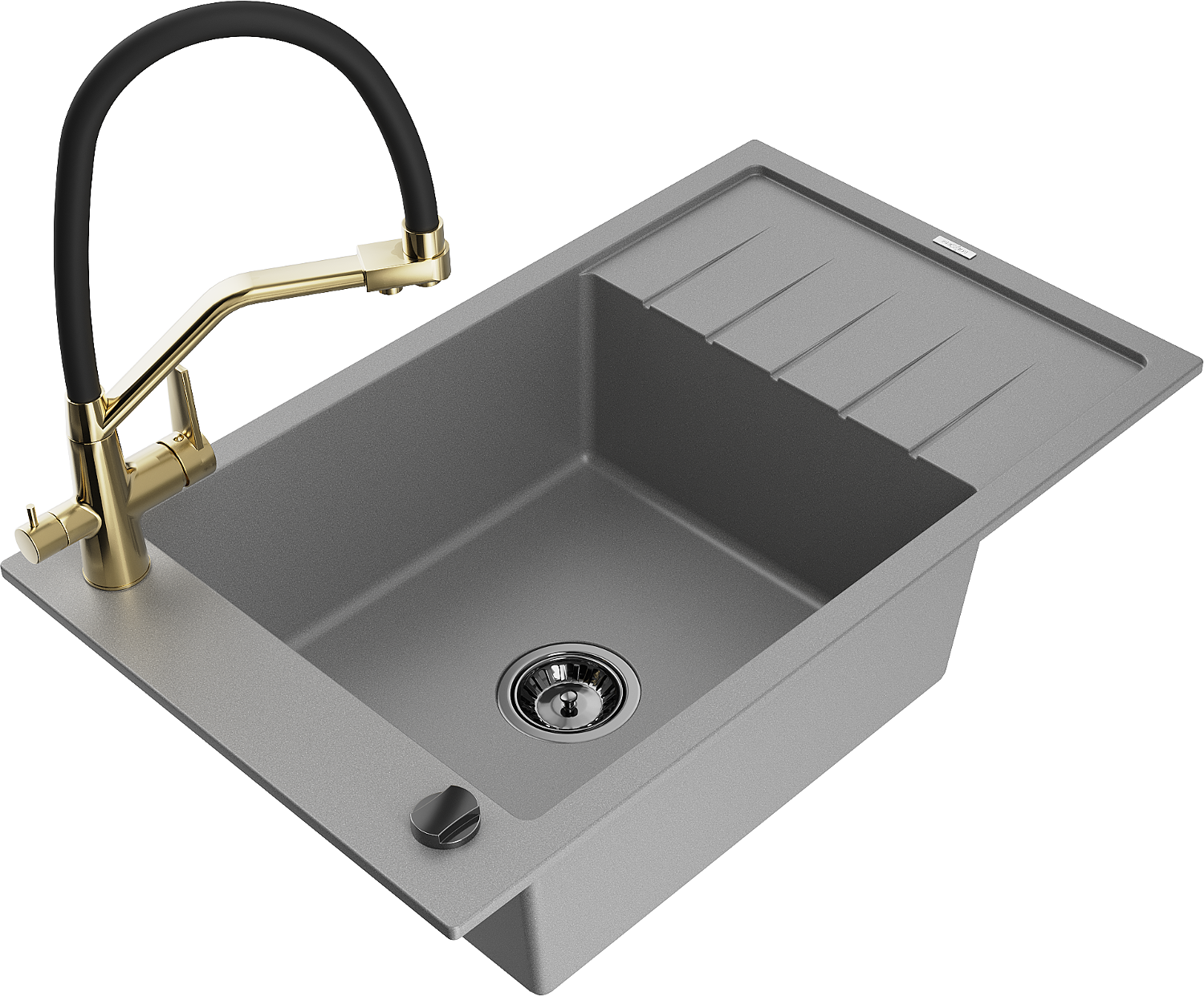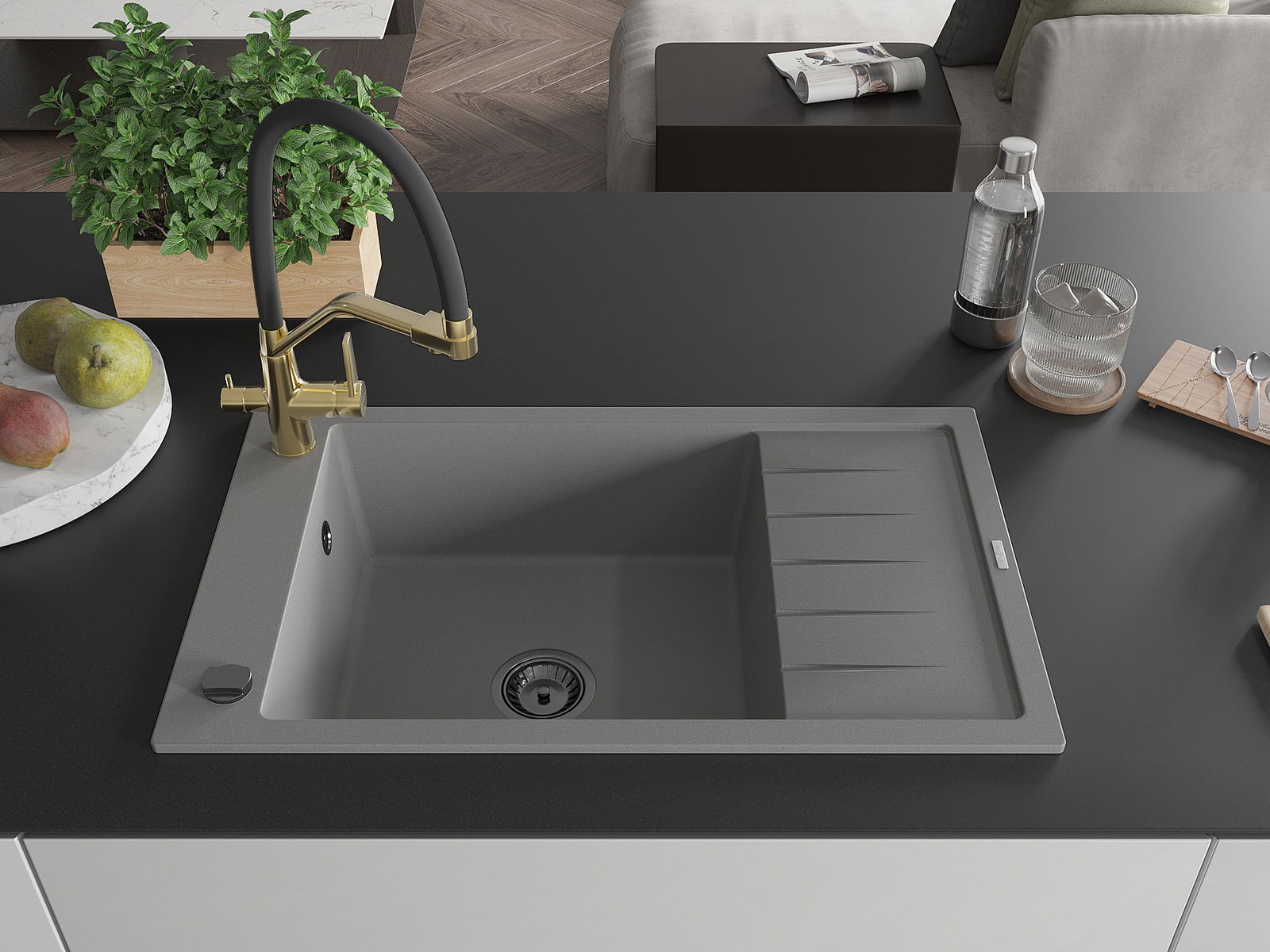 Mexen Elias granitový dřez 1-komorový s odkapávačem a kuchyňskou baterií Duo, šedý - 6511-71-671701-57-B