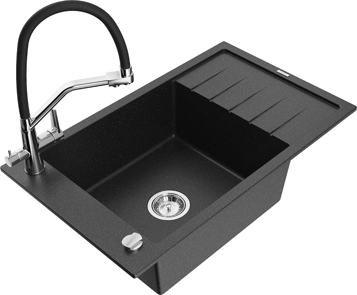 • Mexen Elias granitový dřez 1-komorový s odkapávačem a kuchyňskou baterií Duo, černý/stříbrný metalický - 6511-73-671701-07