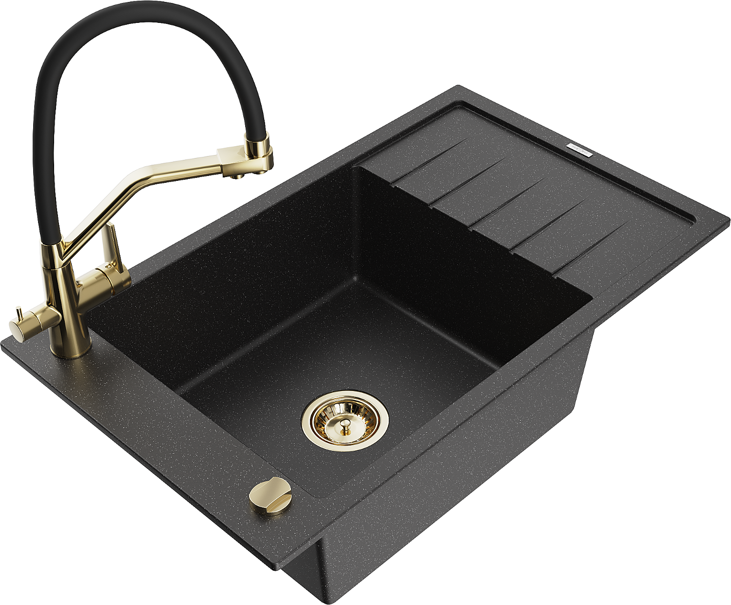 Mexen Elias granitový dřez 1-komorový s odkapávačem a kuchyňskou baterií Duo, černý/stříbrný metalik - 6511-73-671701-57-G