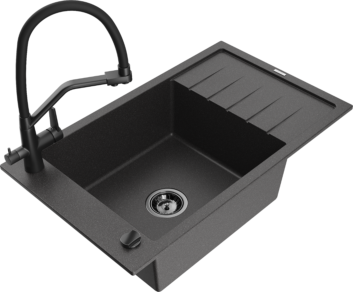 Mexen Elias granitový dřez jednodřez s odkapávačem a kuchyňskou baterií Duo, černý žíhaný - 6511-76-671701-70-B