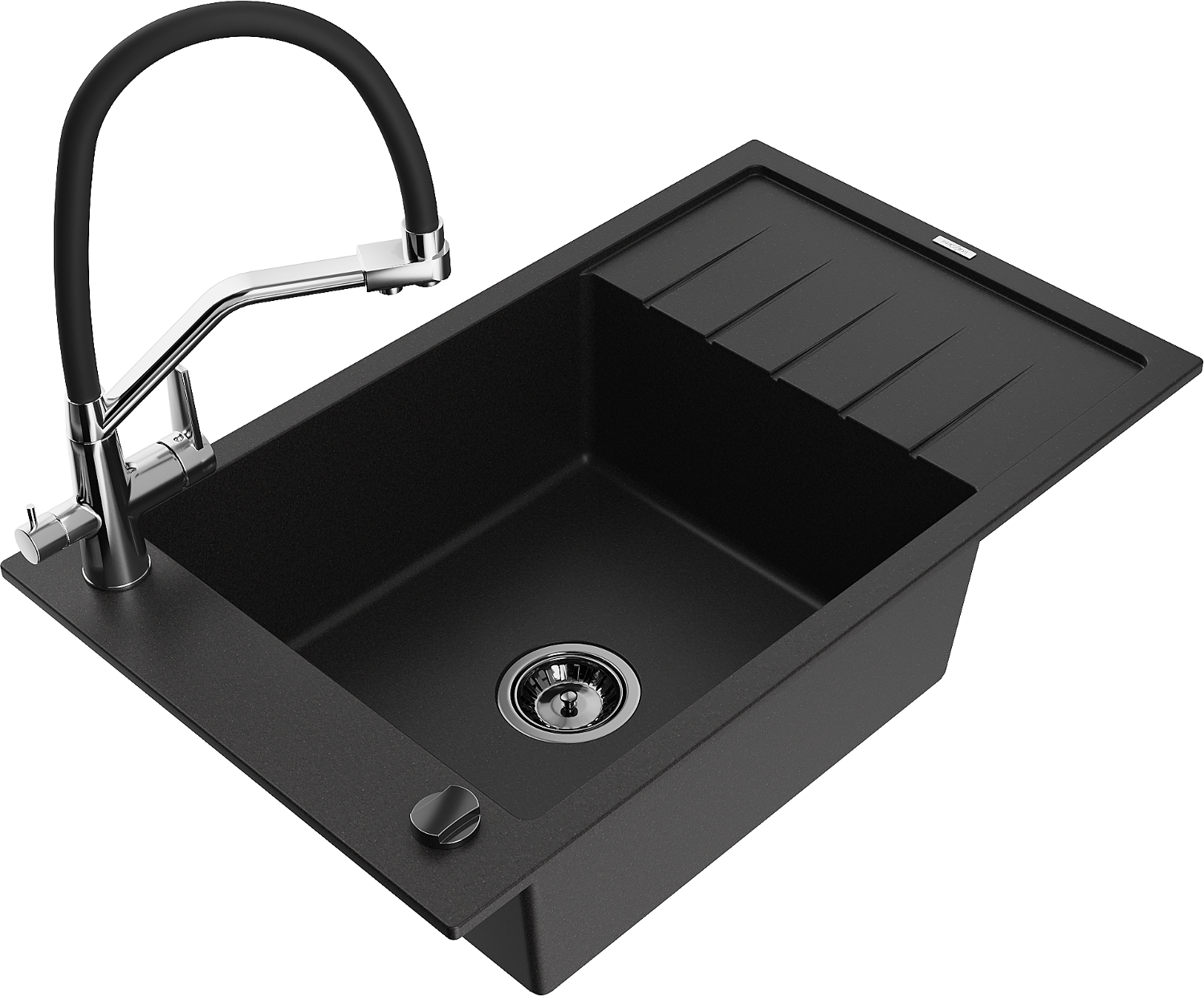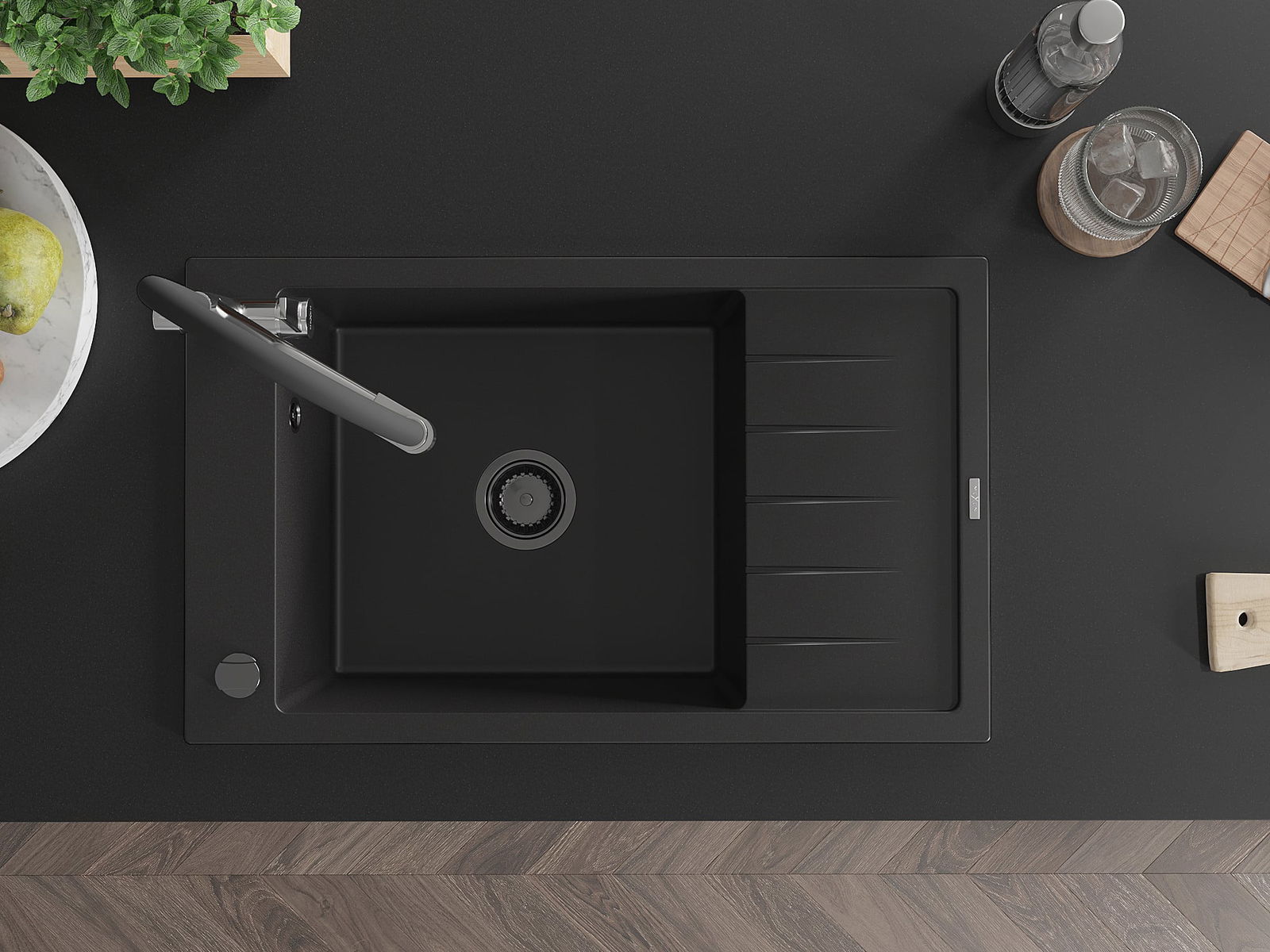 Mexen Elias granitový dřez 1-komorový s odkapávačem a kuchyňskou baterií Duo, černý - 6511-77-671701-07-B