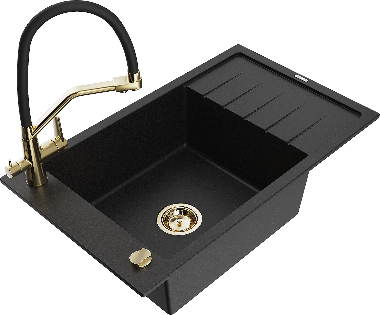 Mexen Elias granitový dřez s jednou komorou a odkapávačem a kuchyňskou baterií Duo, černý - 6511-77-671701-57-G