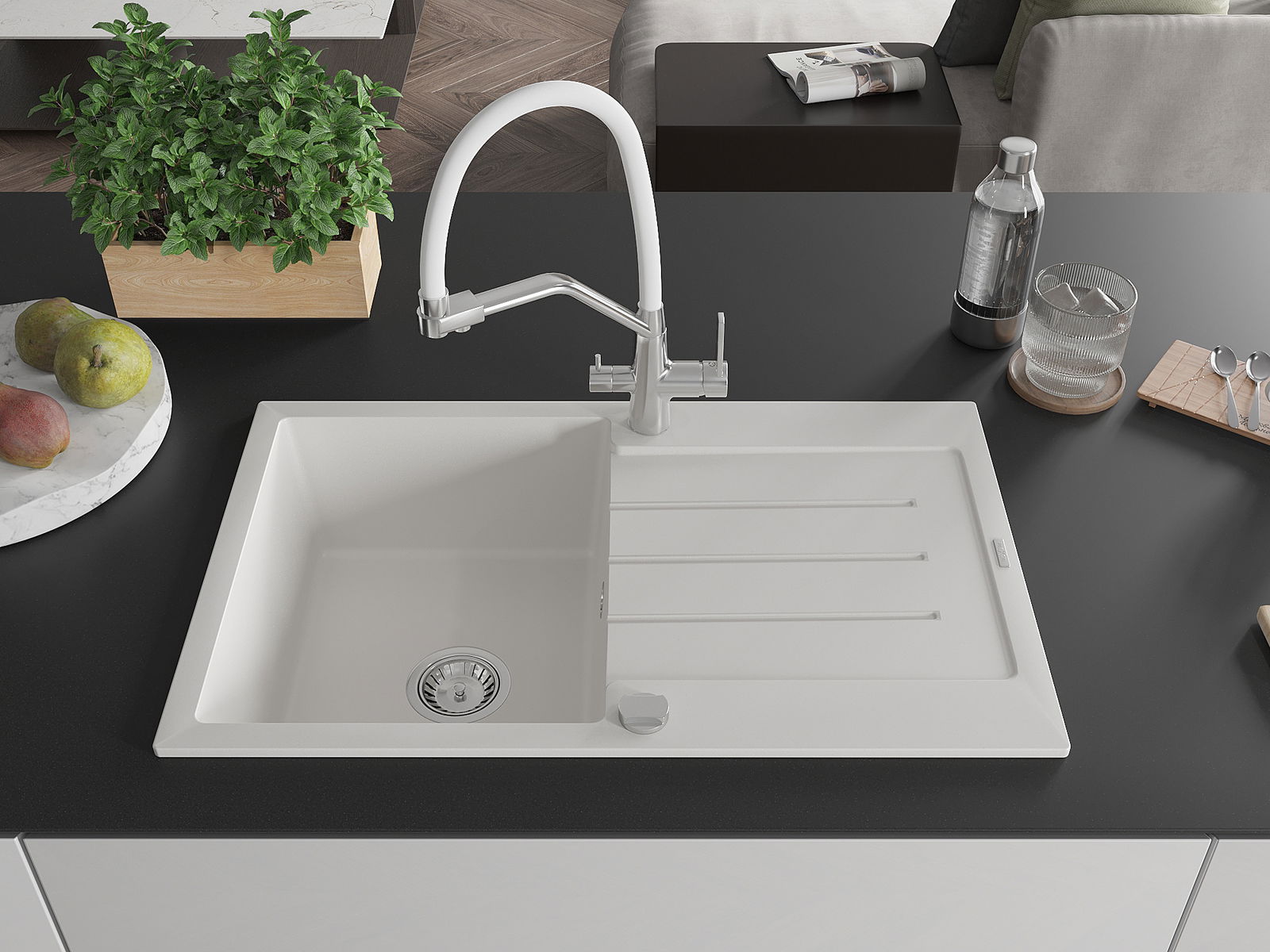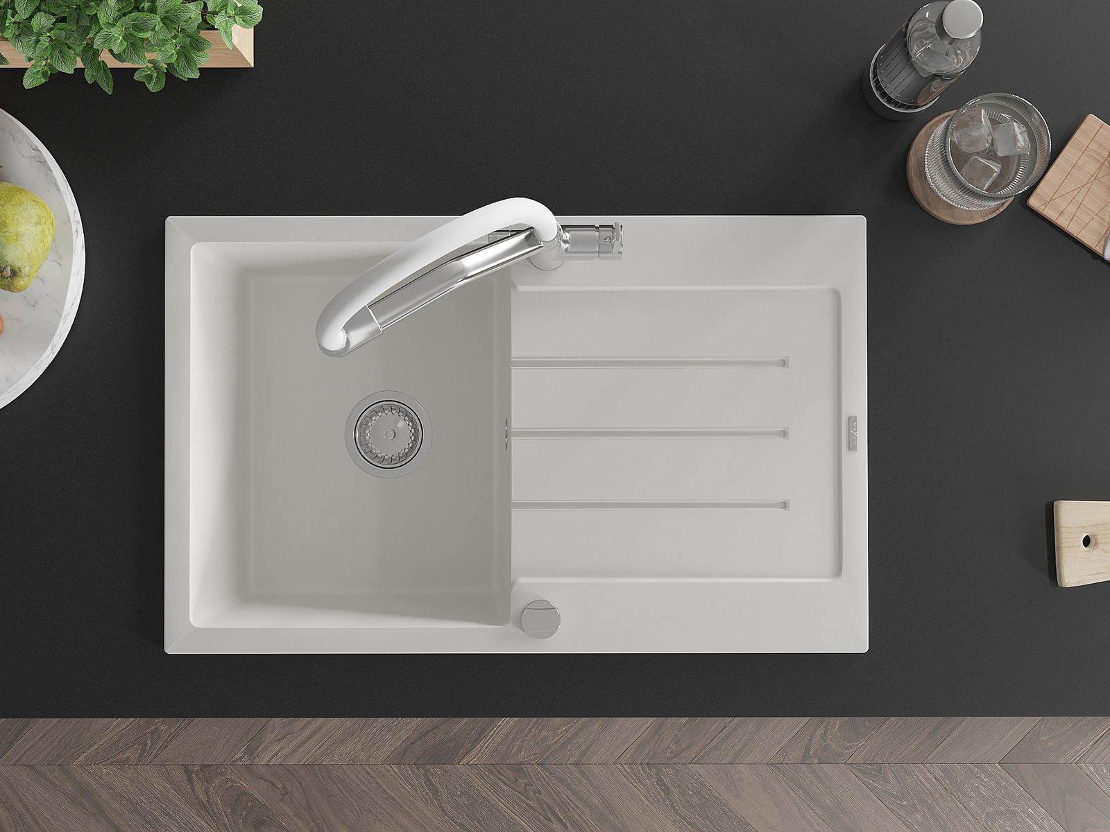 Mexen Bruno granitový dřez 1-komorový s odkapávačem a kuchyňskou baterií Duo, bílý - 6513-20-671701-02