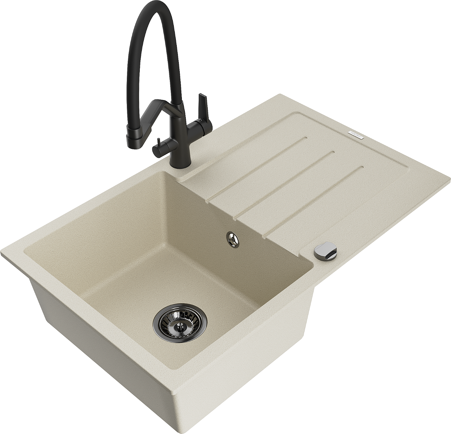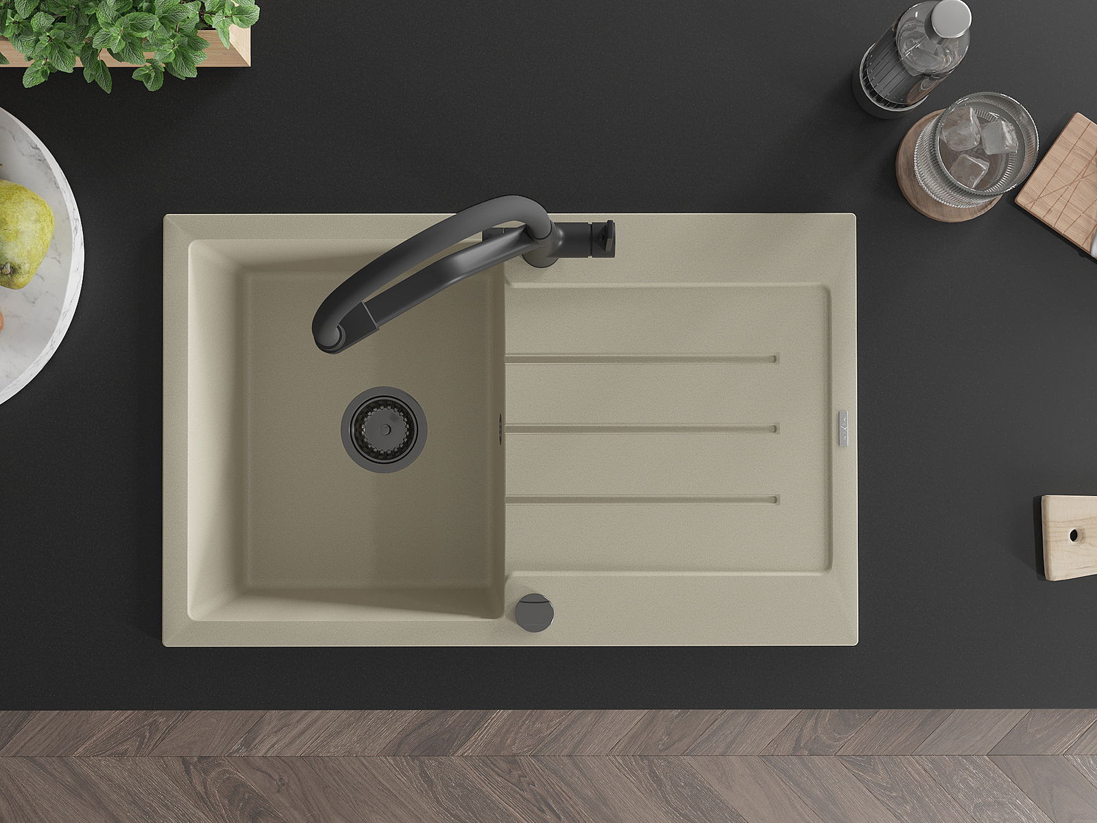 Mexen Bruno granitový dřez 1-komorový s odkapávačem a kuchyňskou baterií Duo, béžový - 6513-69-671701-70-B