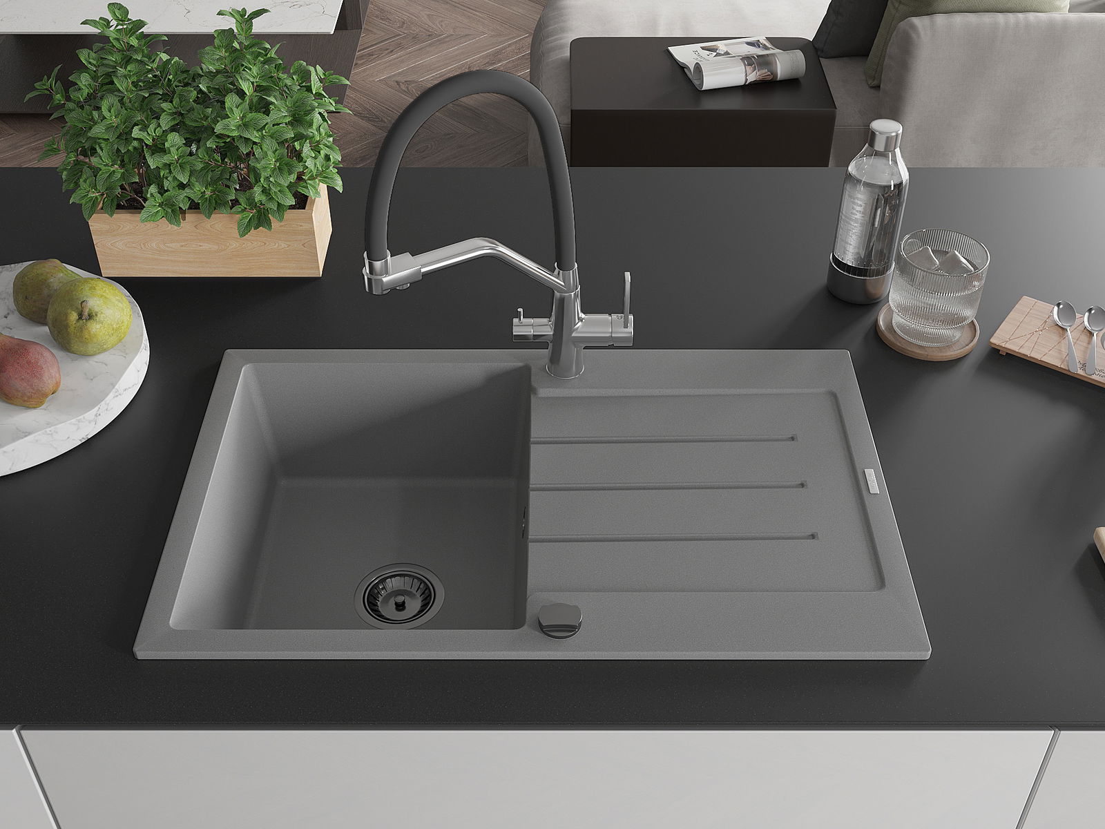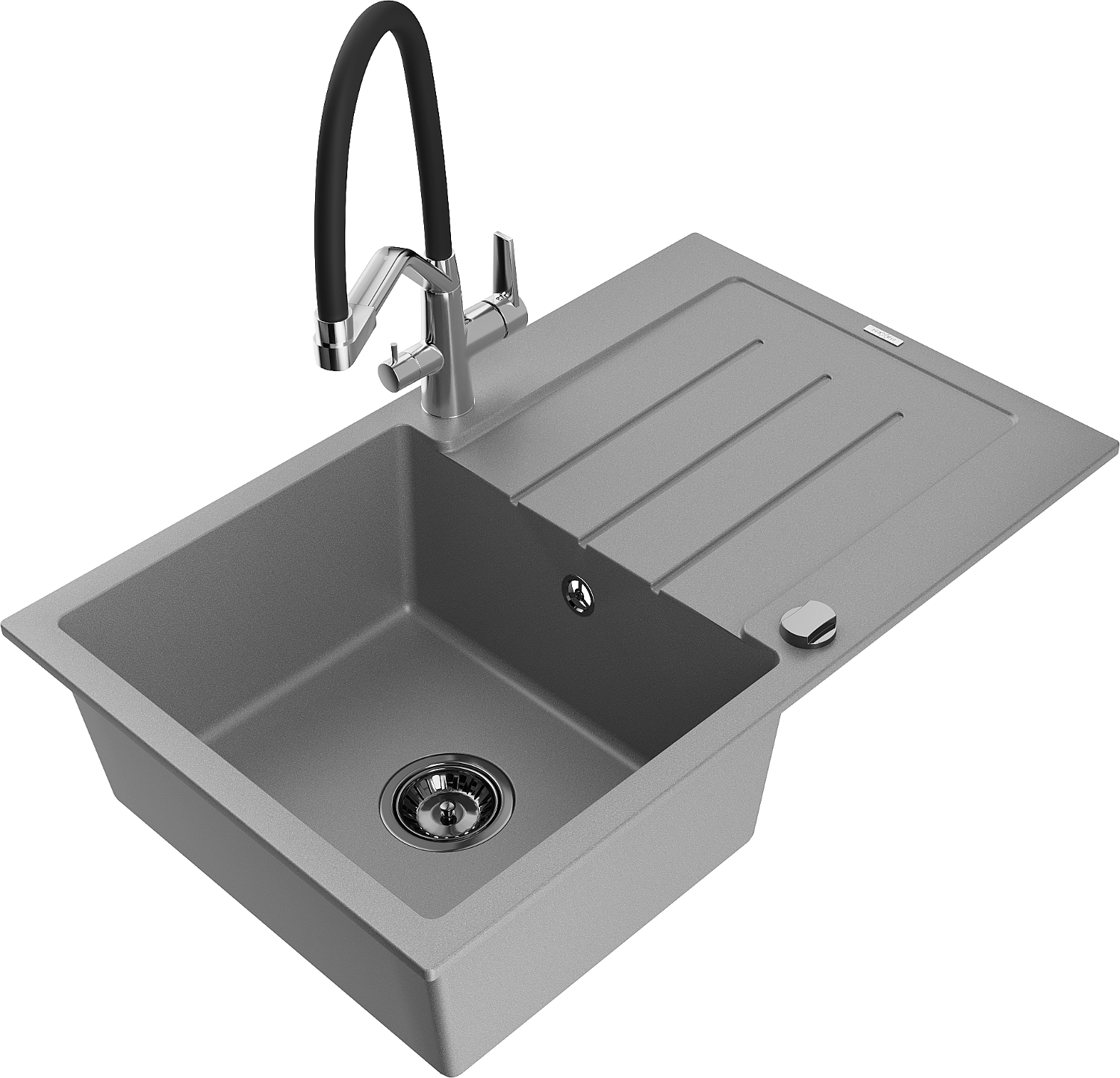 Mexen Bruno granitový dřez 1-komorový s odkapávačem a kuchyňskou baterií Duo, šedý - 6513-71-671701-07-B