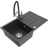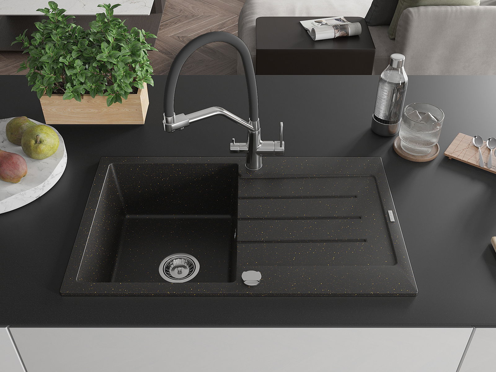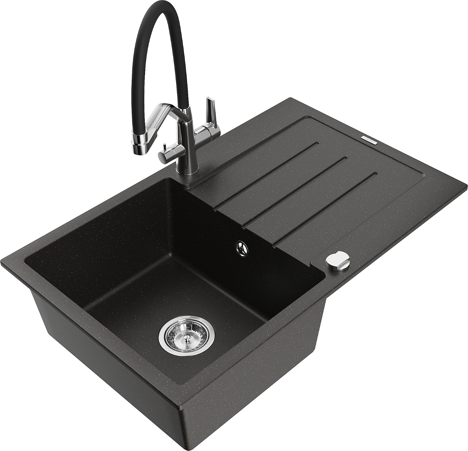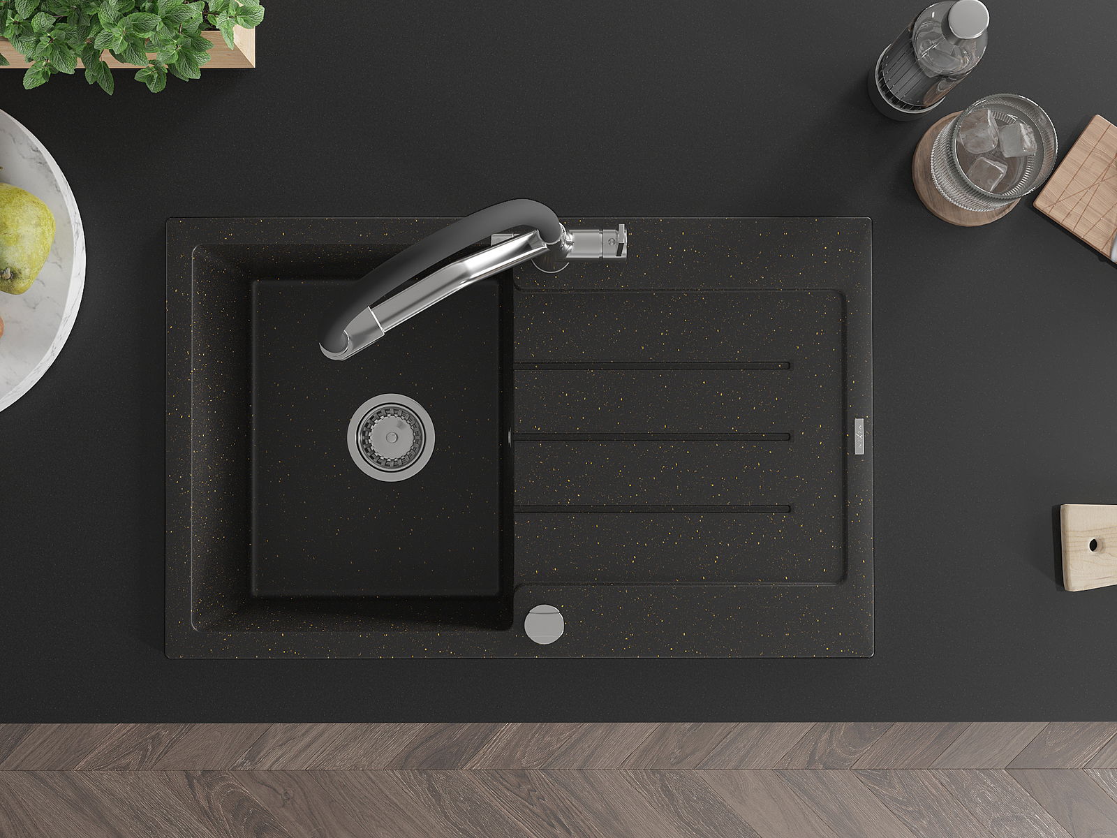 Mexen Bruno granitový dřez s odkapávačem a kuchyňskou baterií Duo, černý/zlatý metalik - 6513-75-671701-07