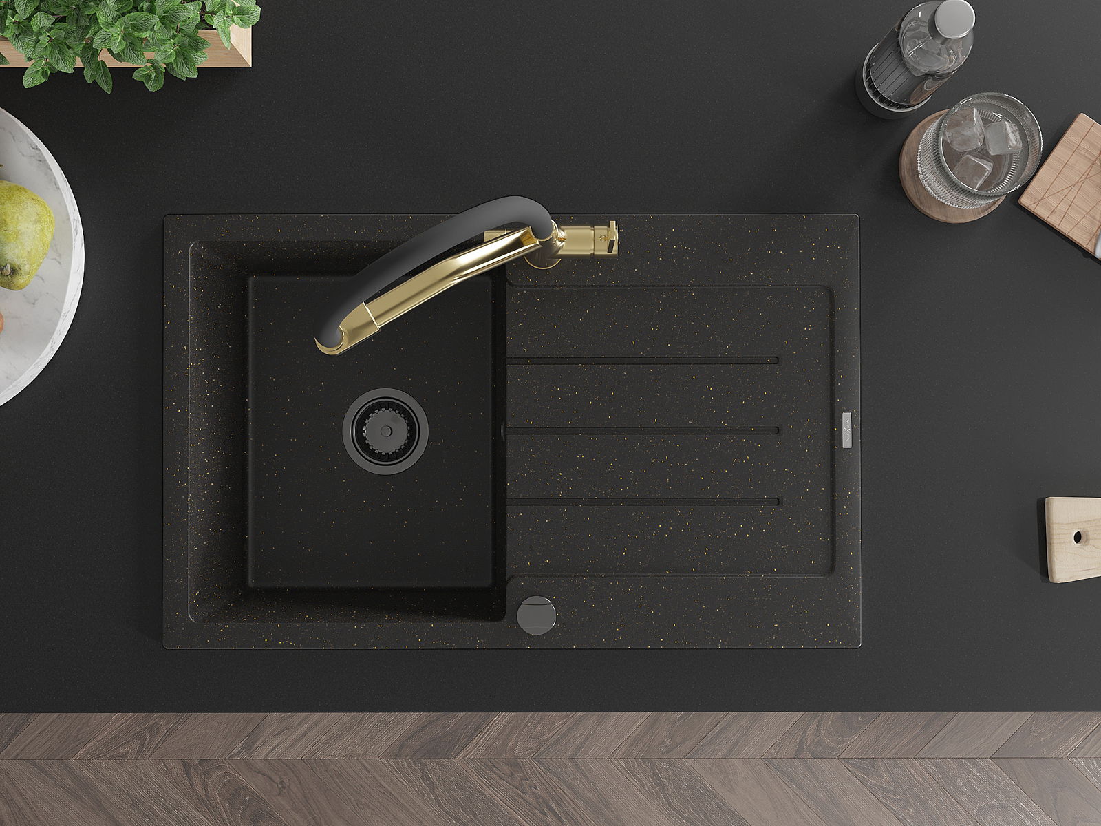 Mexen Bruno granitový dřez s 1 komorou s odkapávačem a kuchyňskou baterií Duo, černý/zlatý metalický - 6513-75-671701-57-B