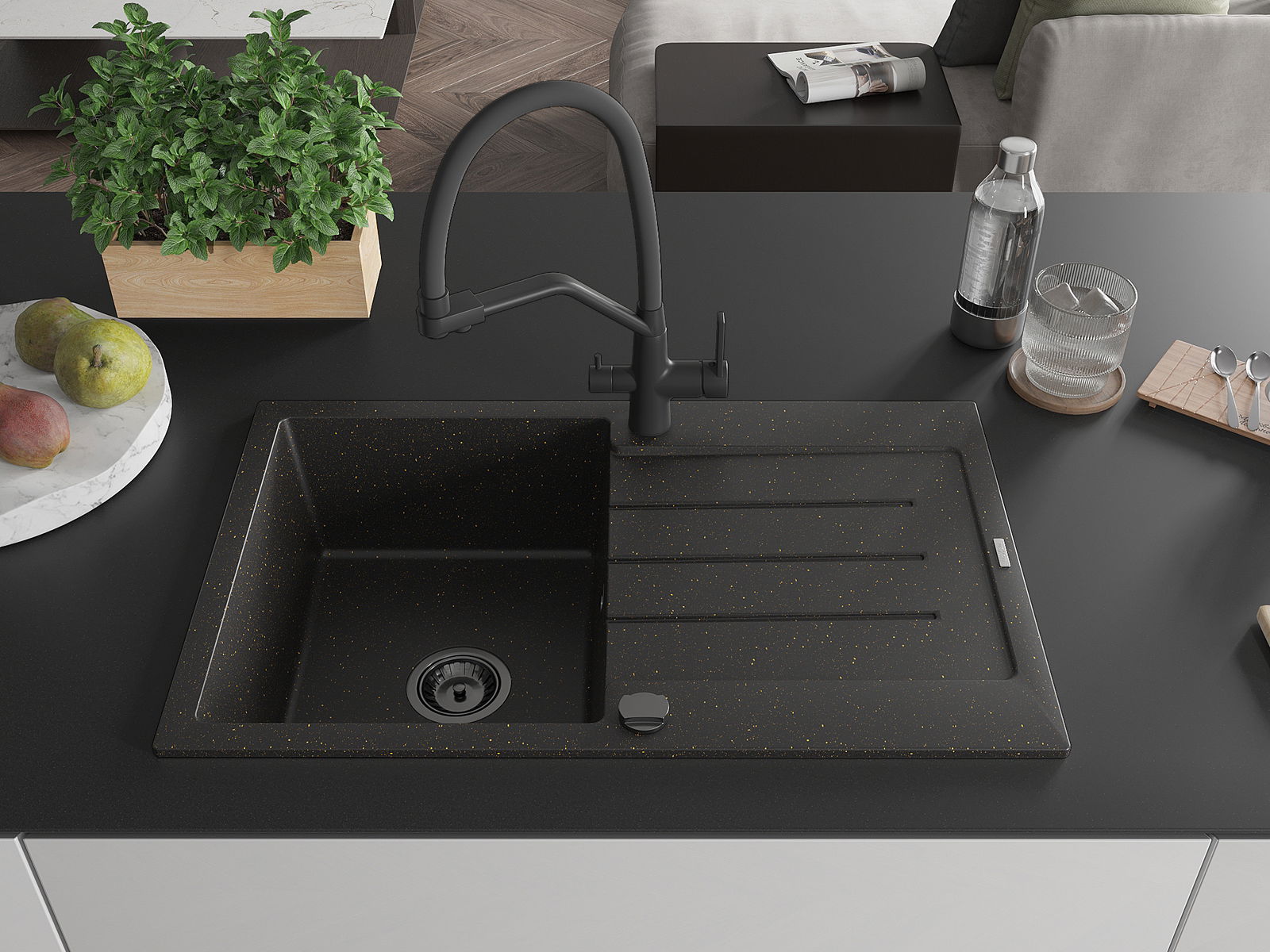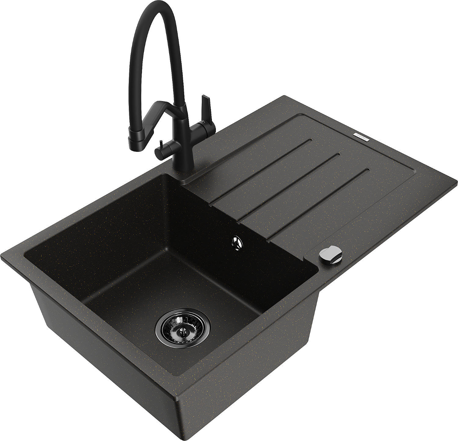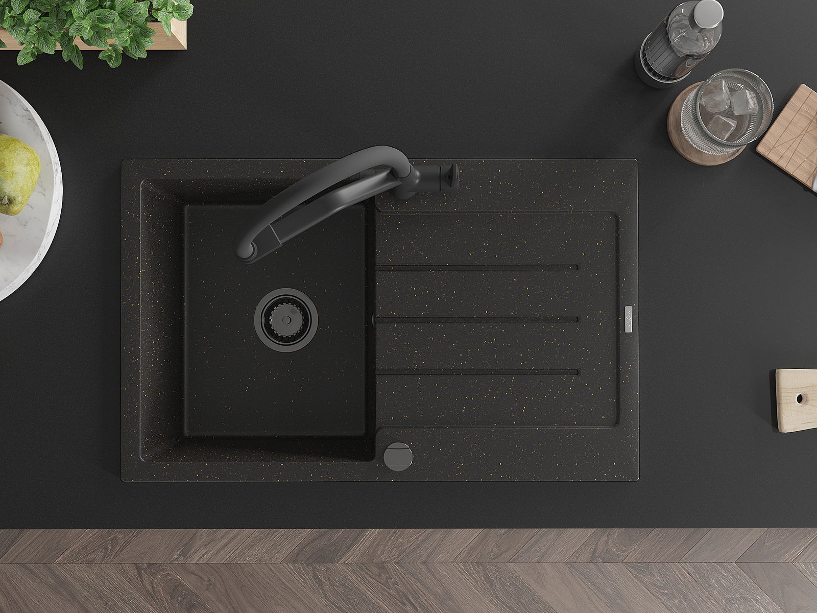 Mexen Bruno granitový dřez s 1 komorou s odkapávačem a kuchyňskou baterií Duo, černý/zlatý metalik - 6513-75-671701-70-B