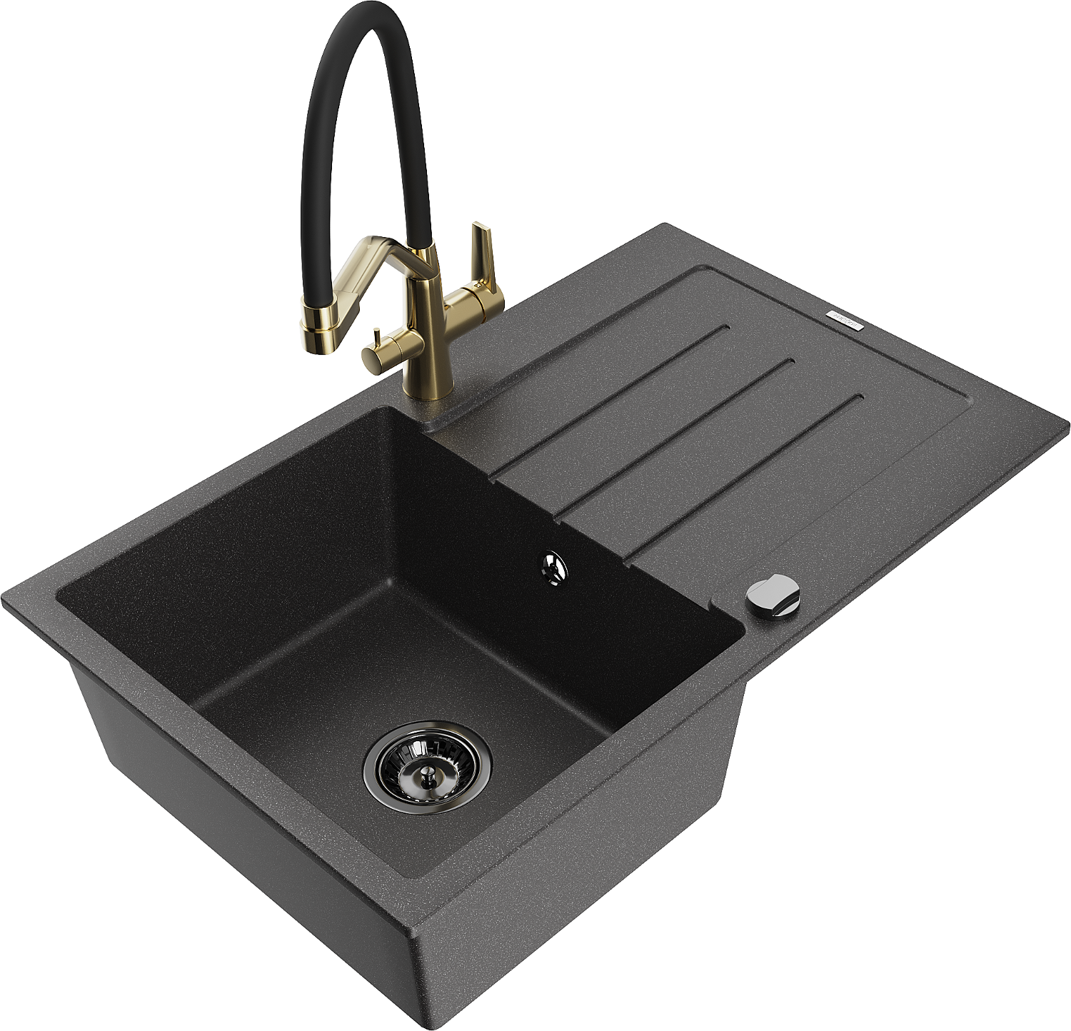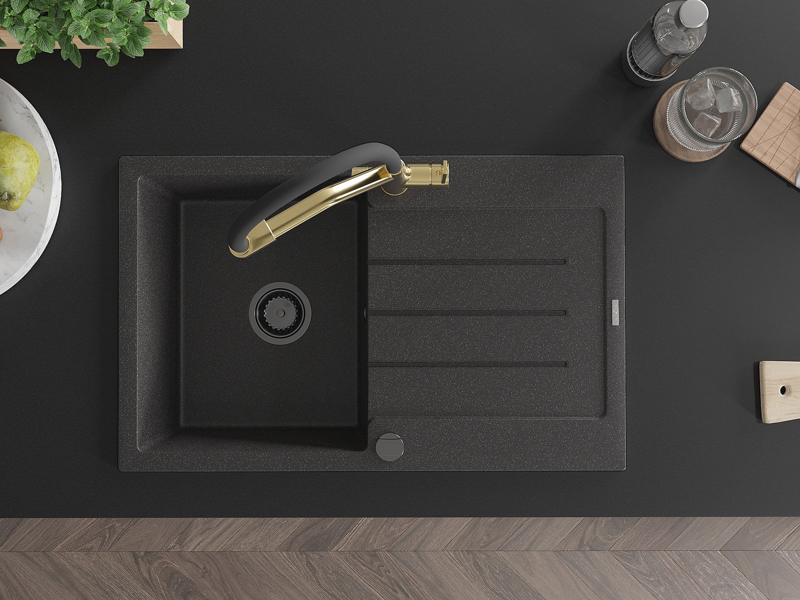 Mexen Bruno granitový dřez s 1 komorou s odkapávačem a kuchyňskou baterií Duo, černý s tečkováním - 6513-76-671701-57-B