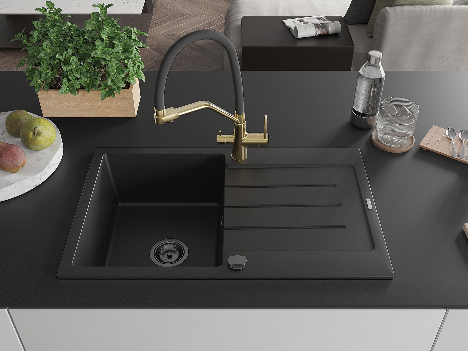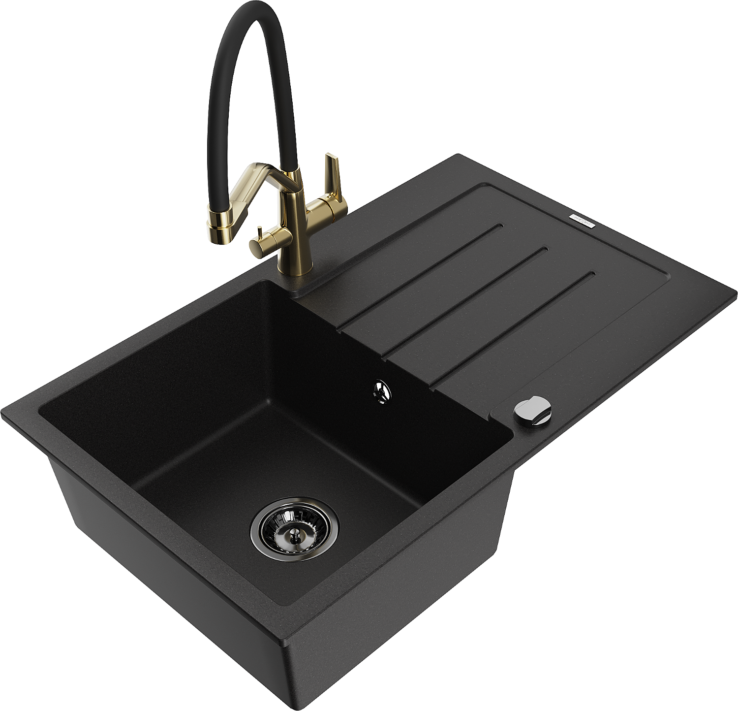 Mexen Bruno granitový dřez 1-komorový s odkapávačem a kuchyňskou baterií Duo, černý - 6513-77-671701-57-B