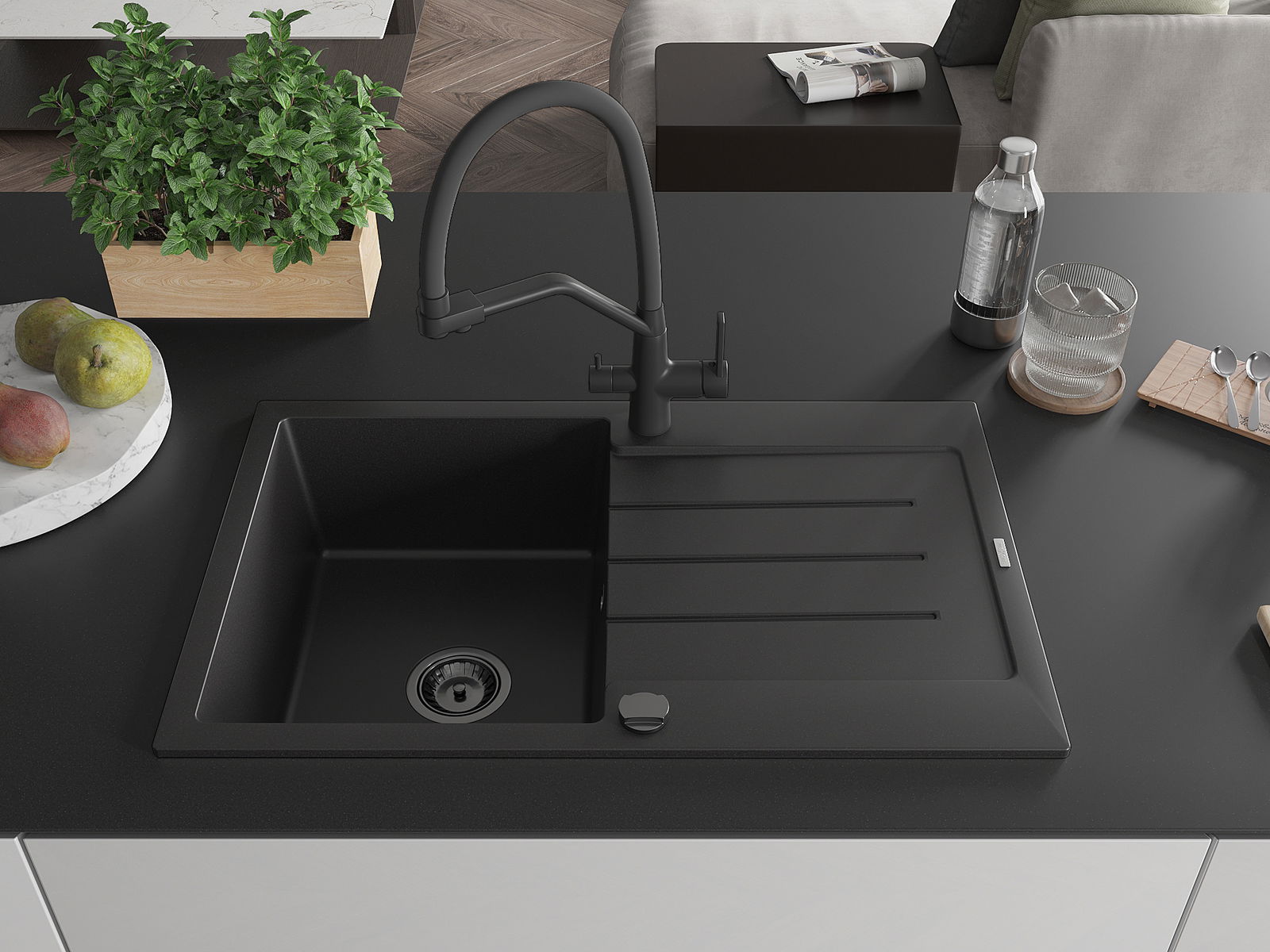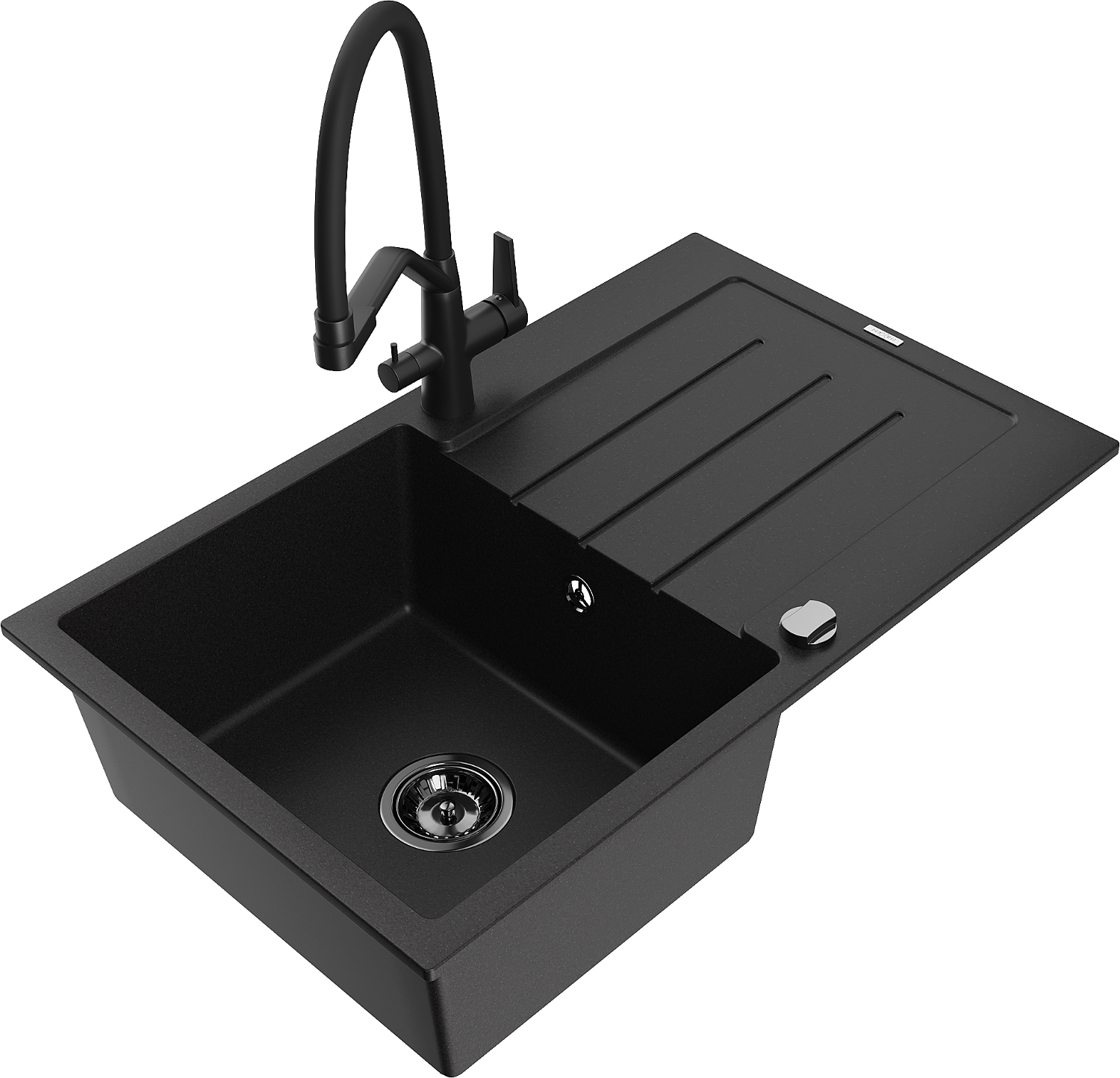 Mexen Bruno granitový dřez s odkapávačem a kuchyňskou baterií Duo, černý - 6513-77-671701-70-B