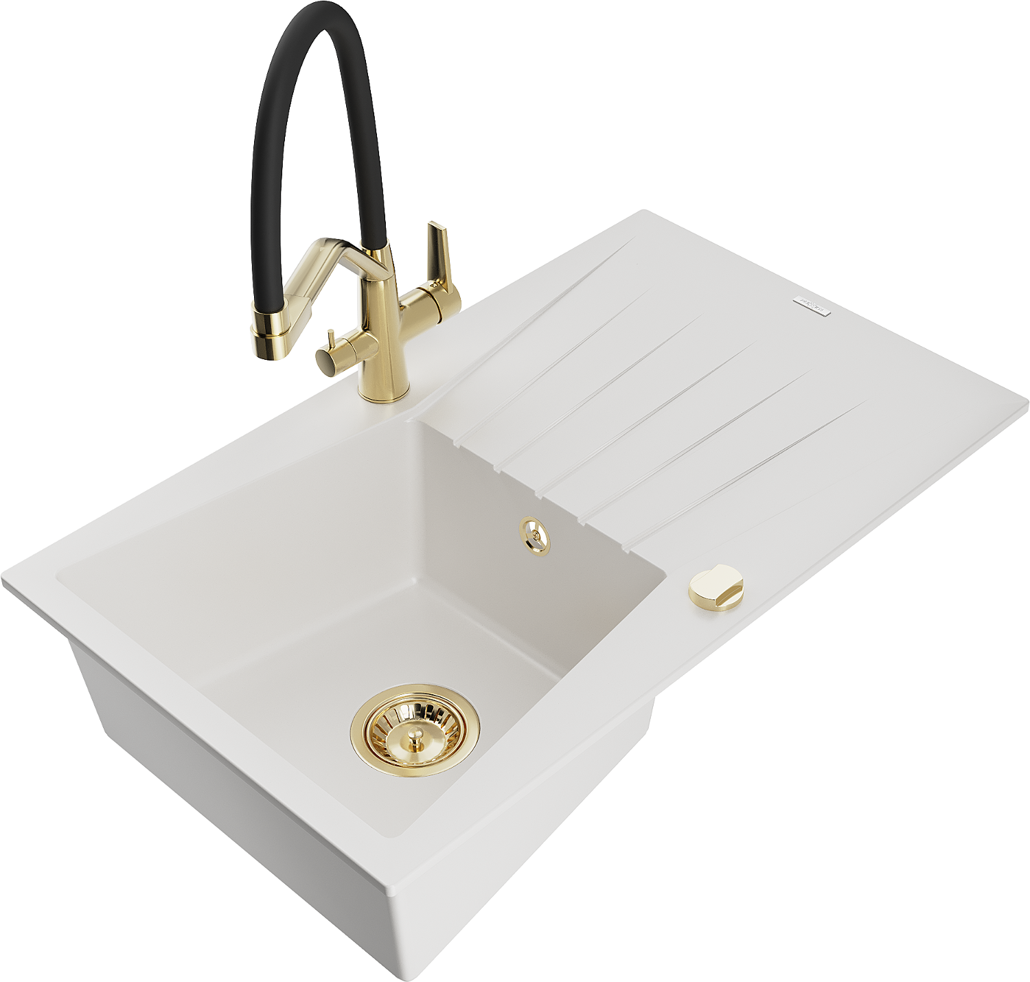 Mexen Cesar granitový dřez 1-komorový s odkapávačem a kuchyňskou baterií Duo, bílý - 6514-20-671701-57-G