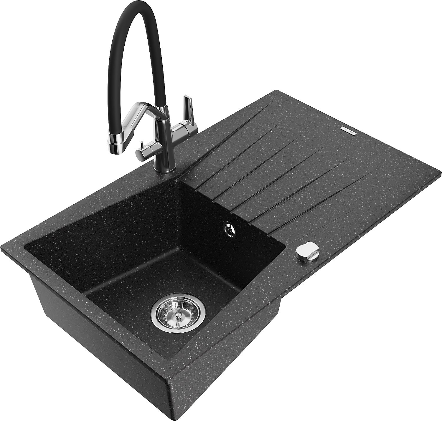 Mexen Cesar žulový dřez s 1 komorou s odkapávačem a kuchyňskou baterií Duo, černá/stříbrná metalíza - 6514-73-671701-07