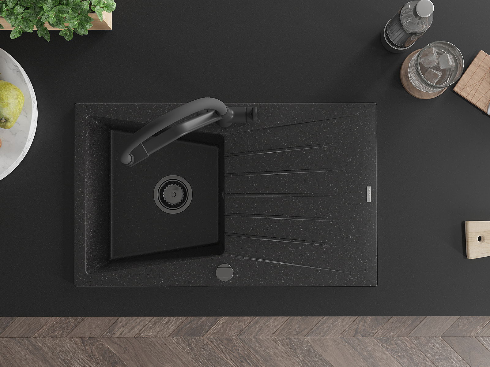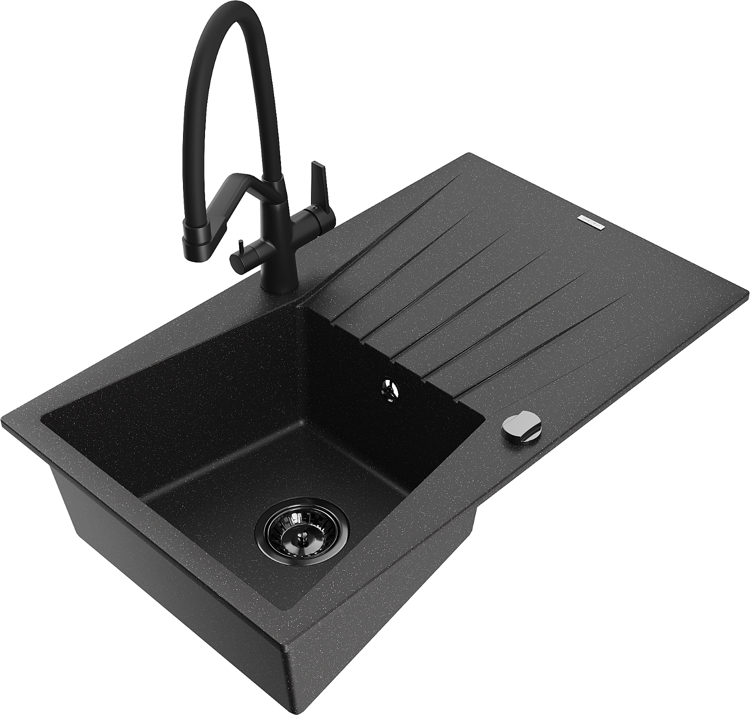 Mexen Cesar granitový dřez s 1 komorou, odkapávačem a kuchyňskou baterií Duo, černý/stříbrný metalik - 6514-73-671701-70-B