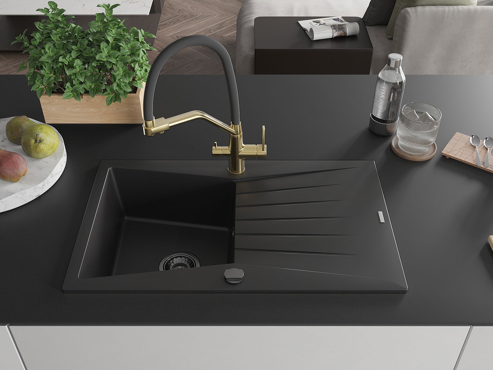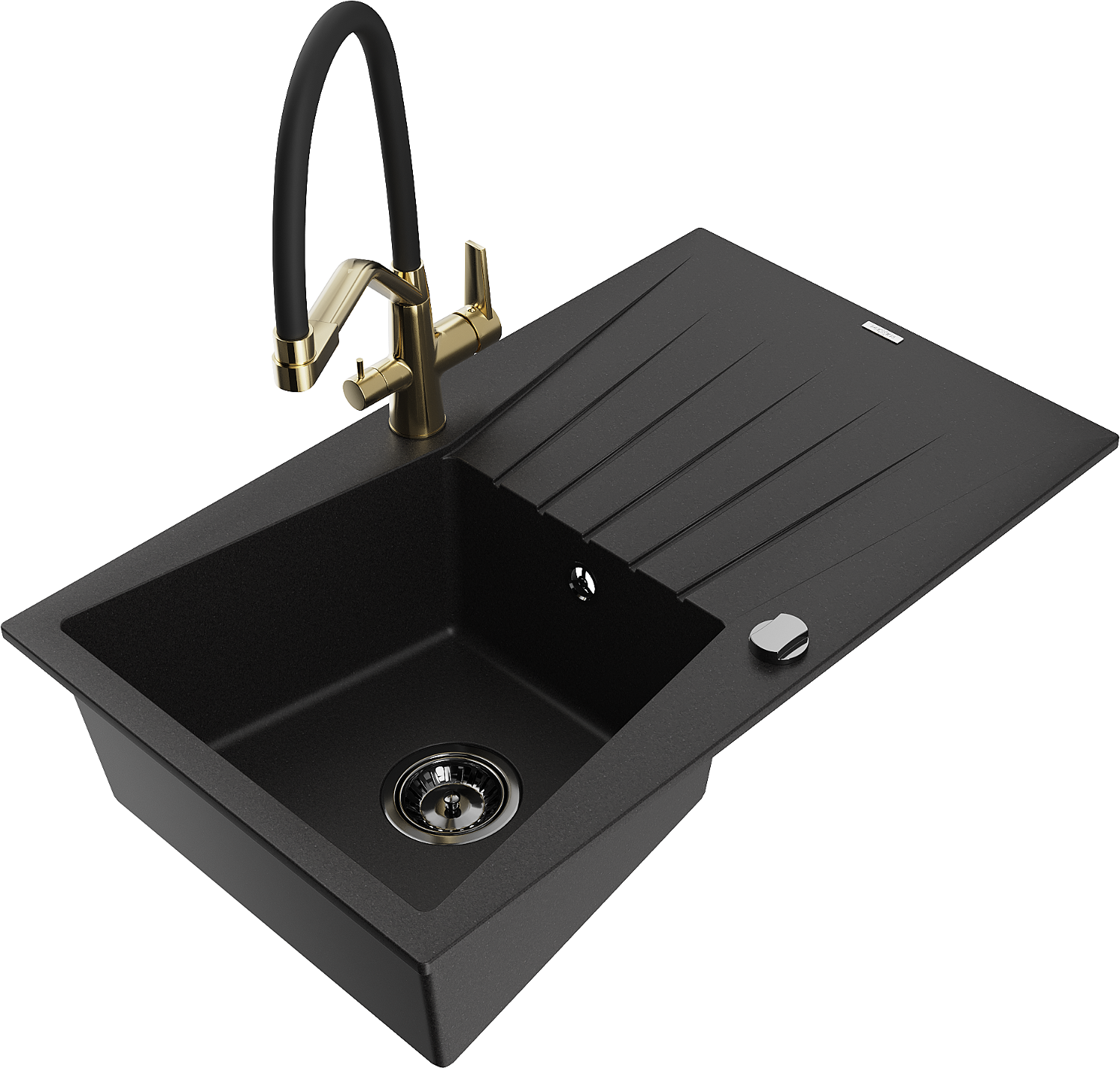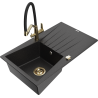 • Mexen Cesar granitový dřez 1-komorový s odkapávačem a kuchyňskou baterií Duo, černý - 6514-77-671701-57-B
