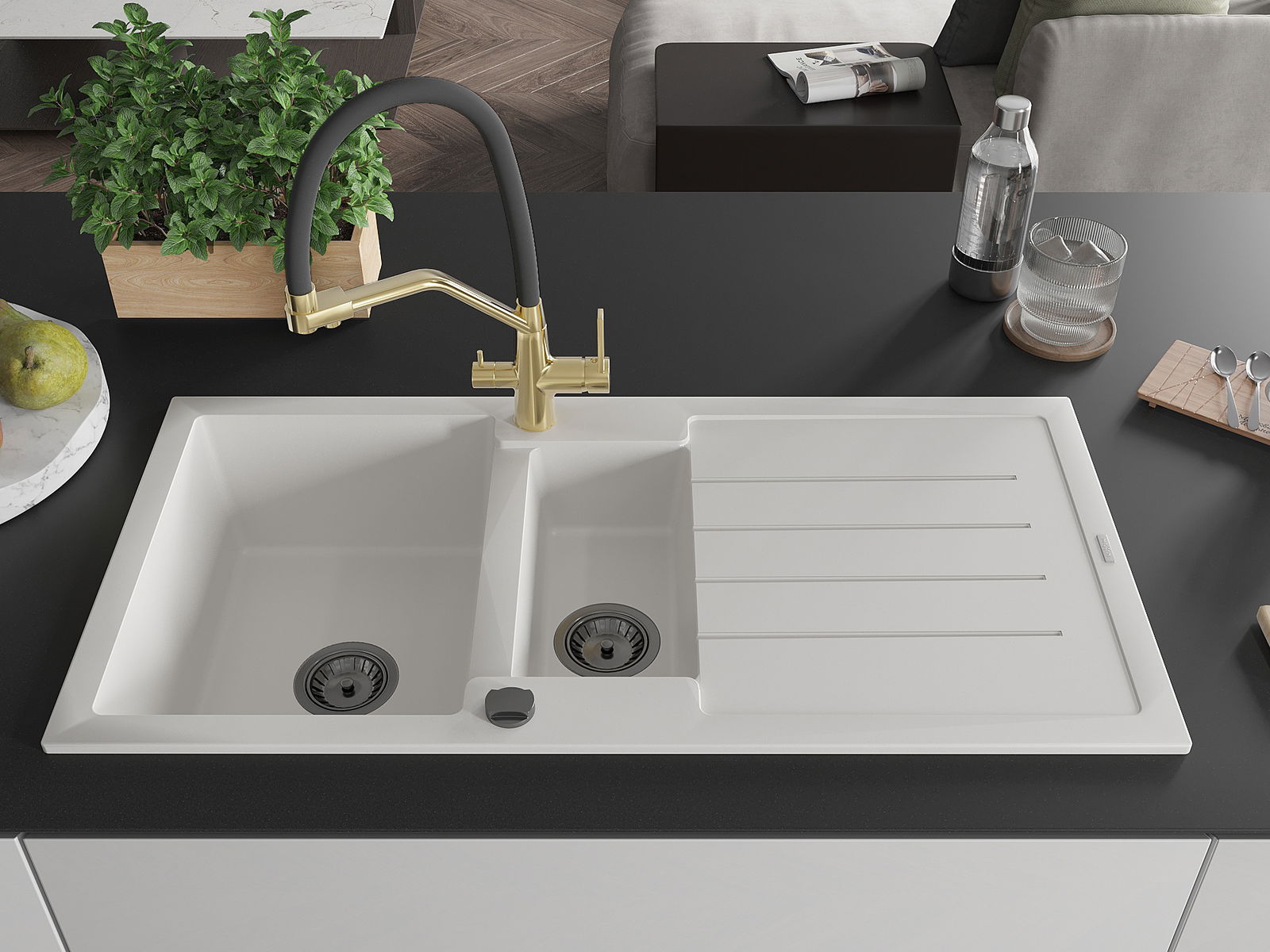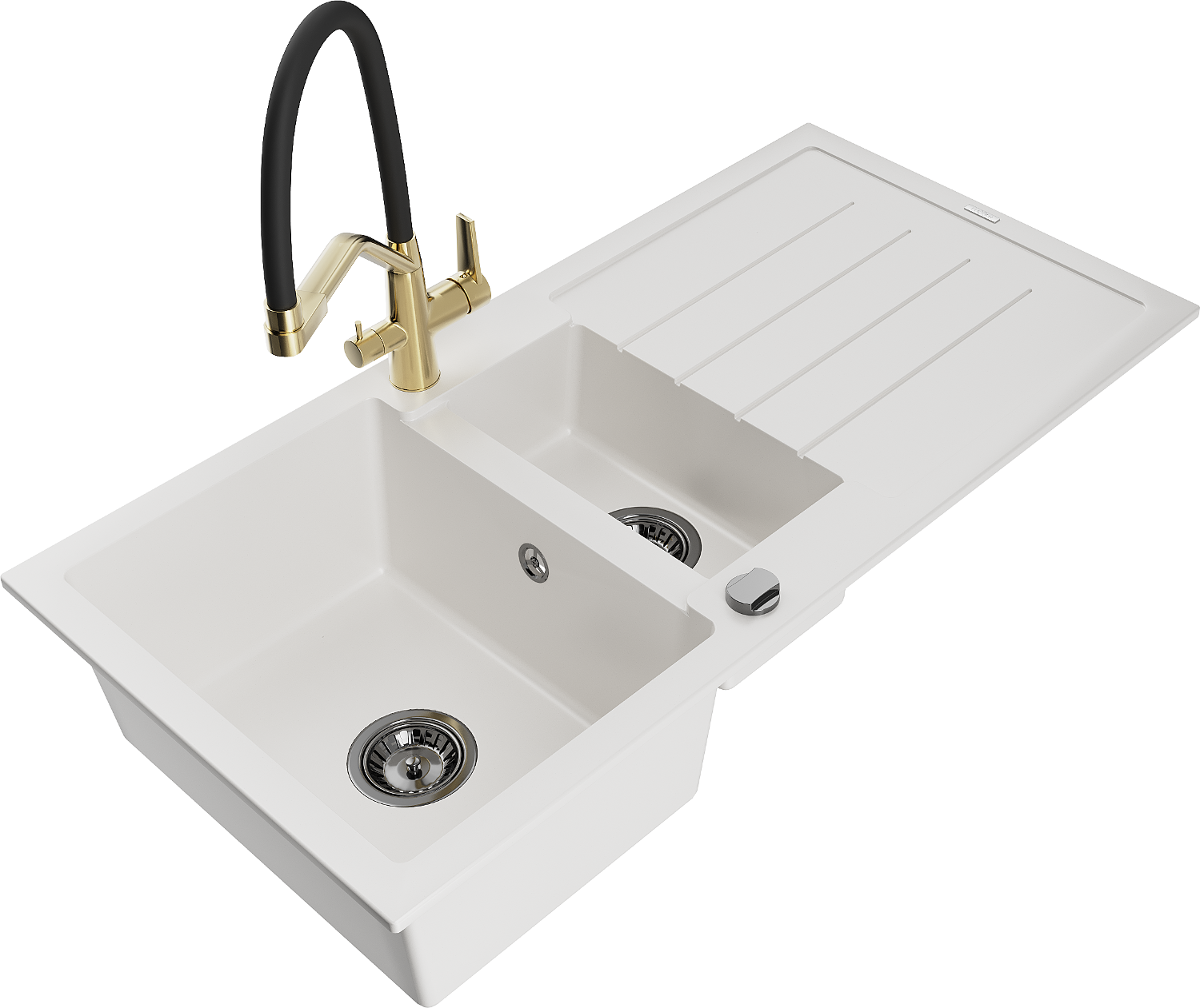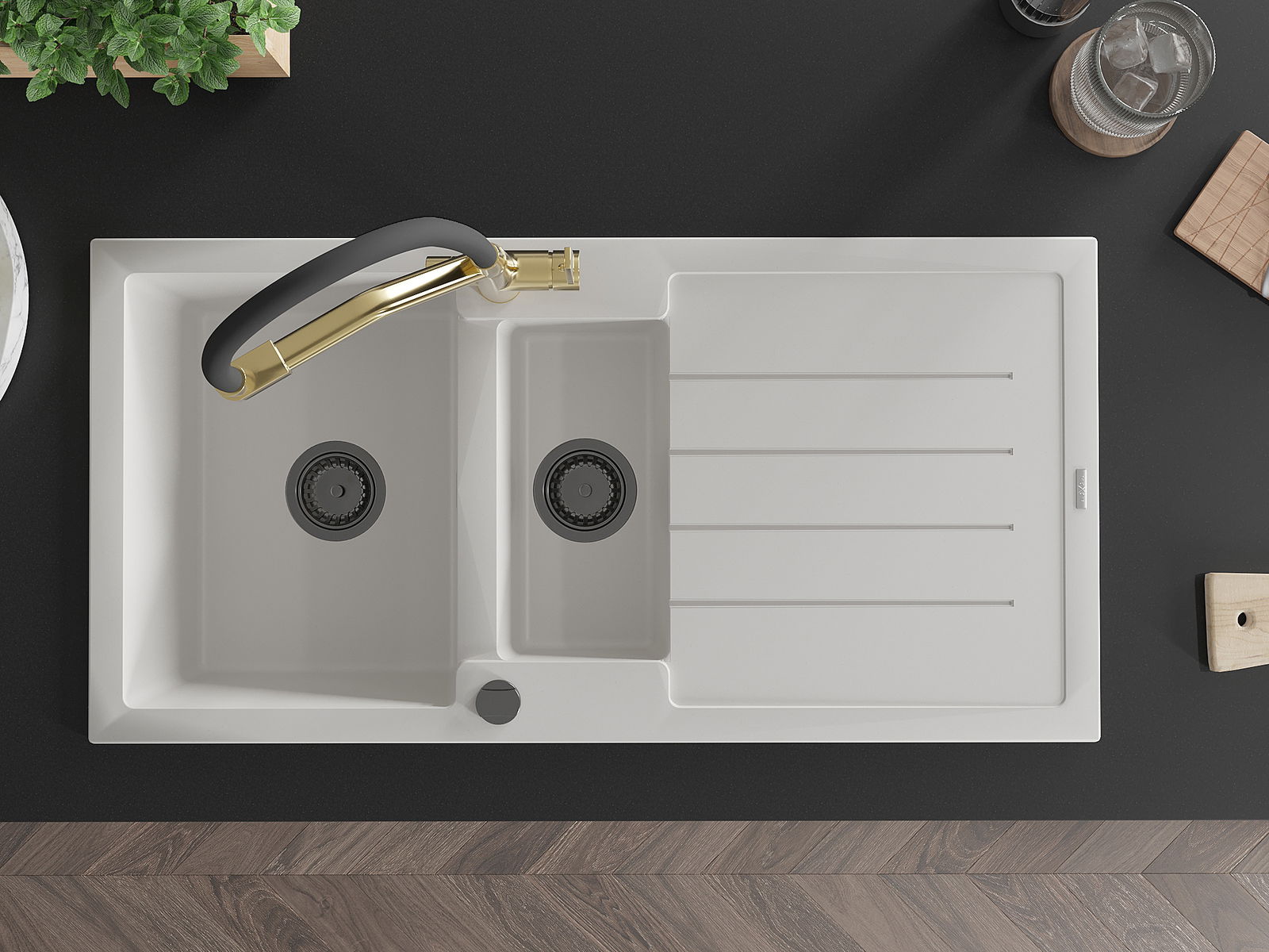 Mexen Andres granitový dřez 1,5-komorový s odkapávačem a kuchyňskou baterií Duo, bílý - 6515-20-671701-57-B