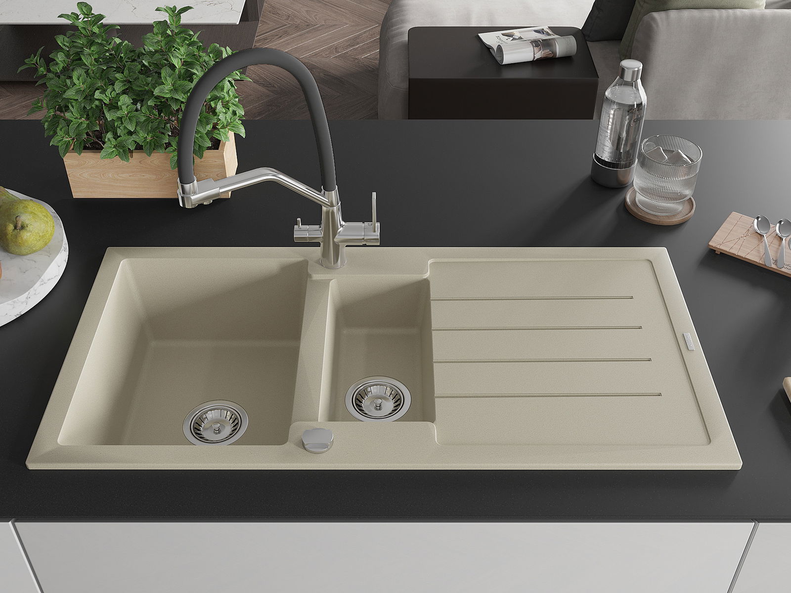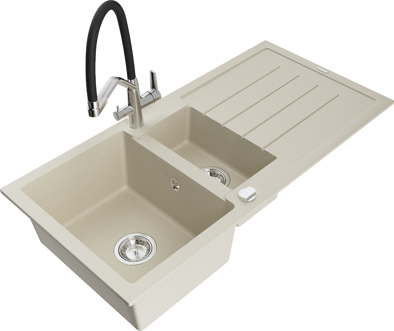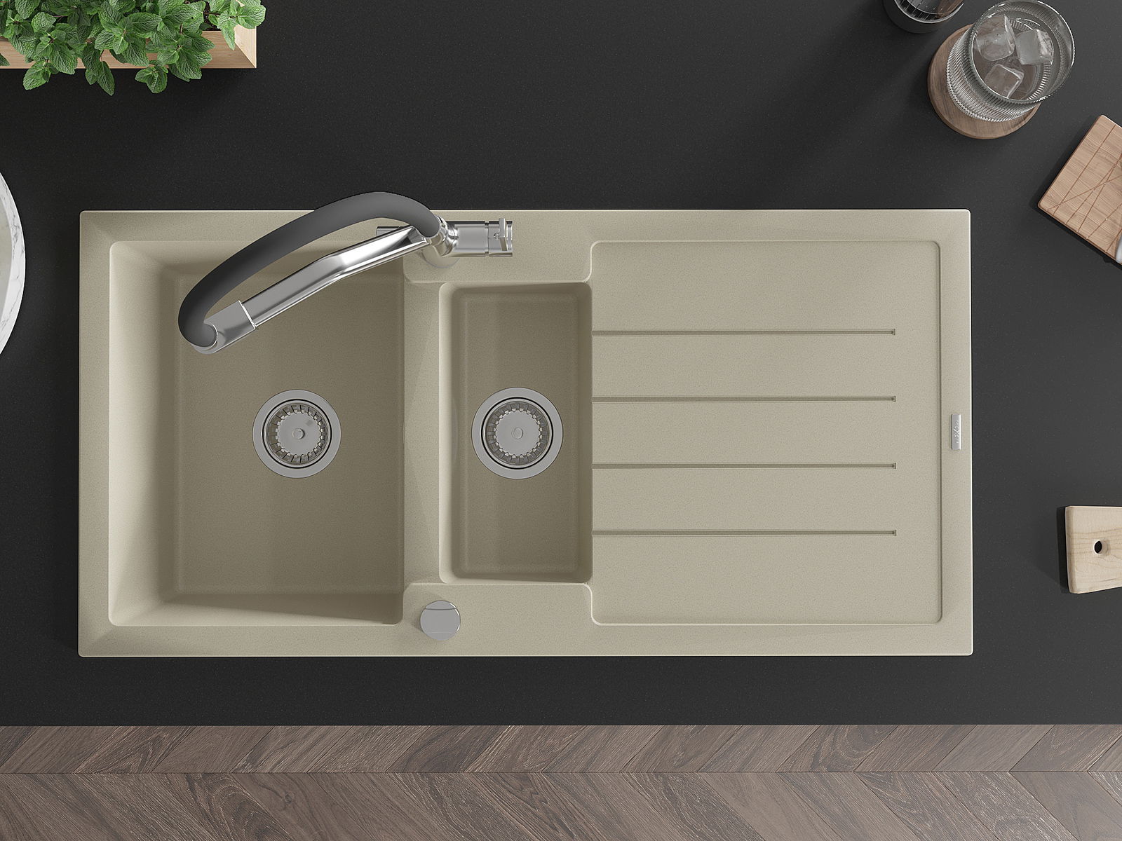 Mexen Andres granitový dřez 1,5-komorový s odkapávačem a kuchyňskou baterií Duo, béžový - 6515-69-671701-07