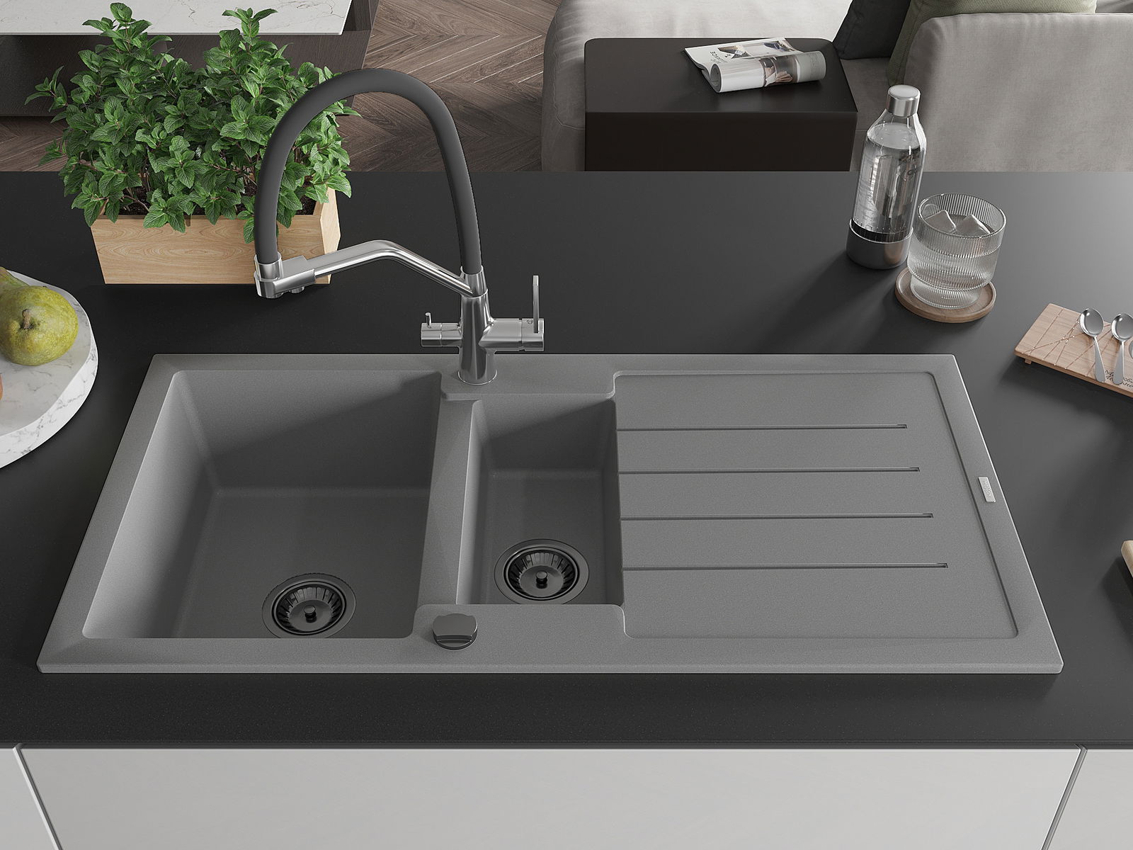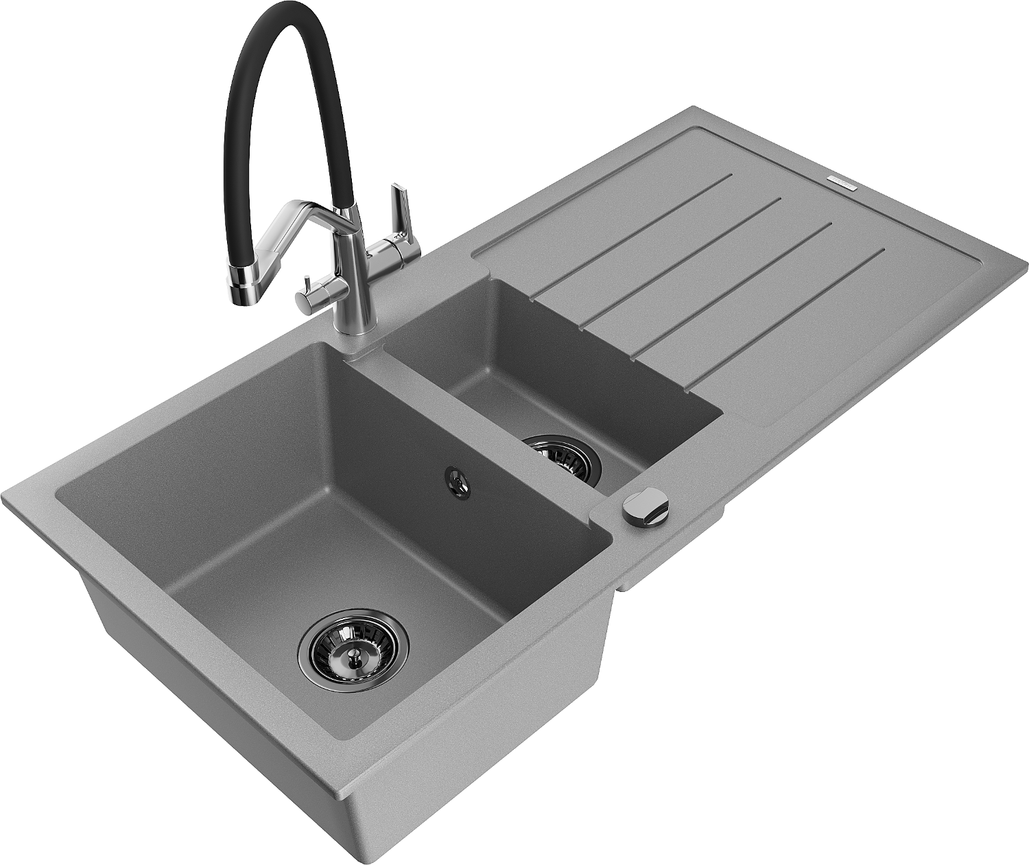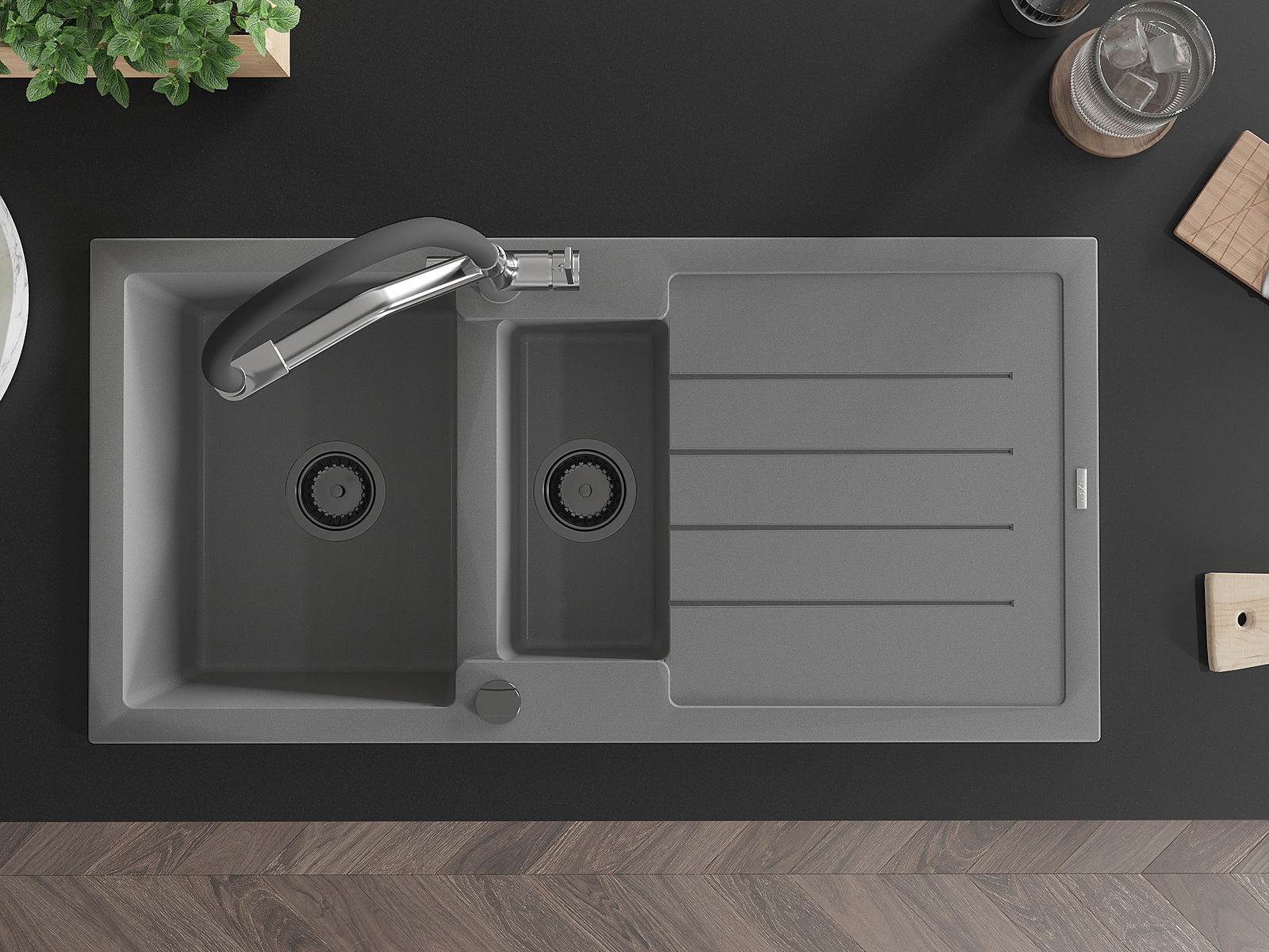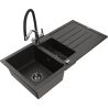 Mexen Andres granitový dřez 1,5-komorový s odkapávačem a kuchyňskou baterií Duo, šedý - 6515-71-671701-07-B