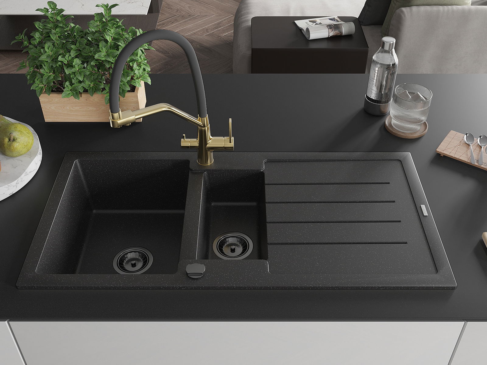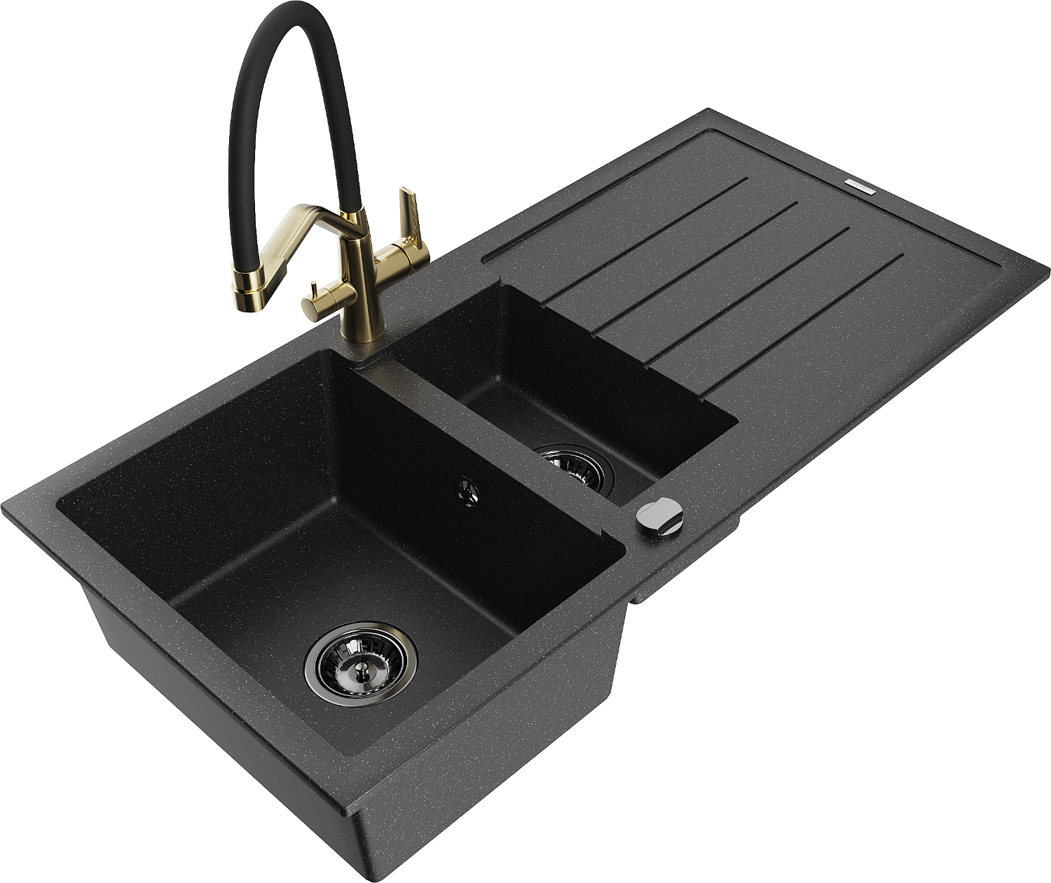 Mexen Andres žulový dřez 1,5-komorový s odkapávačem a kuchyňskou baterií Duo, černý/stříbrný - 6515-73-671701-57-B