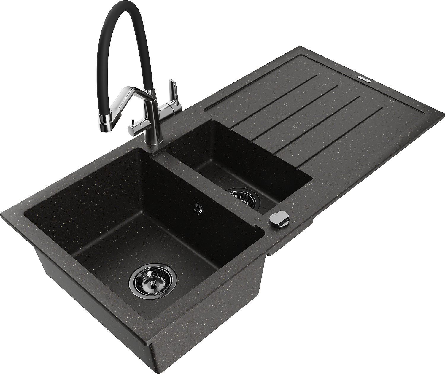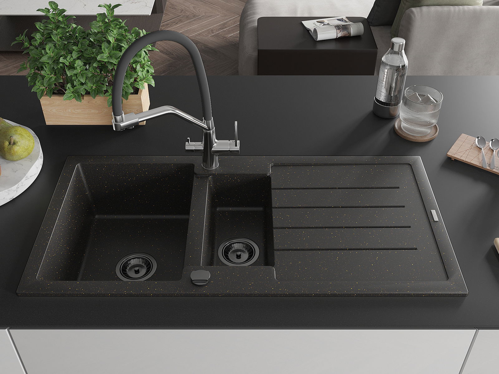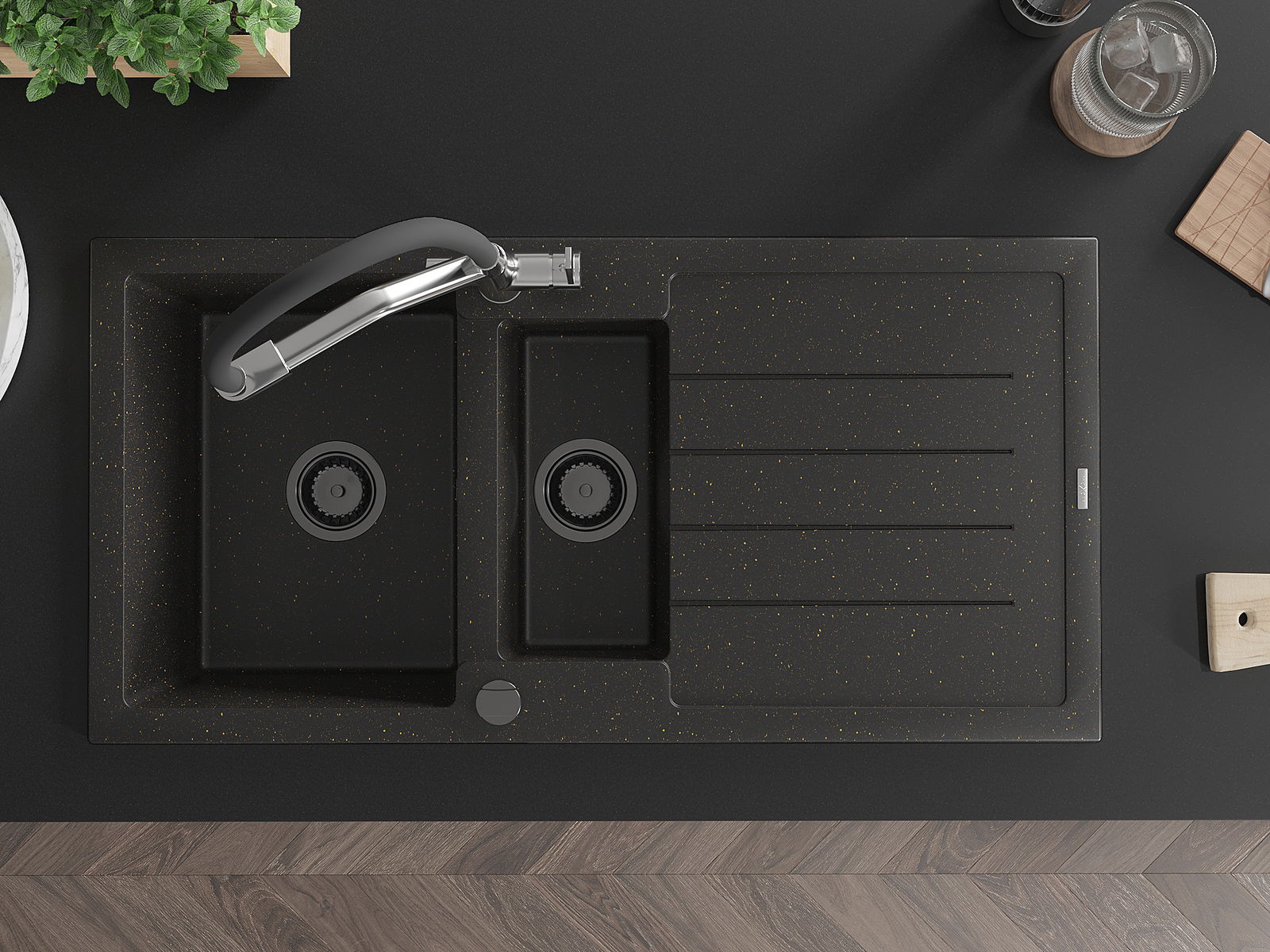 Mexen Andres granitový dřez 1,5 komorový s odkapávačem a kuchyňskou baterií Duo, černý/zlatý metalík - 6515-75-671701-07-B