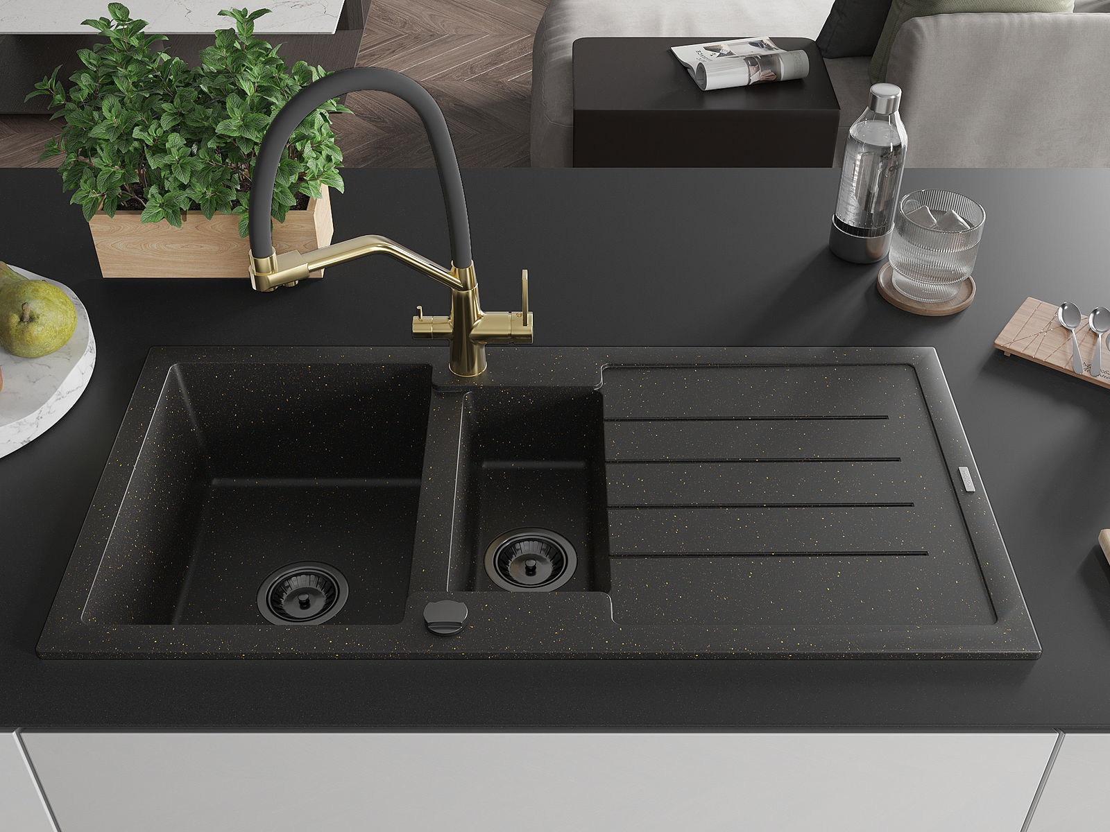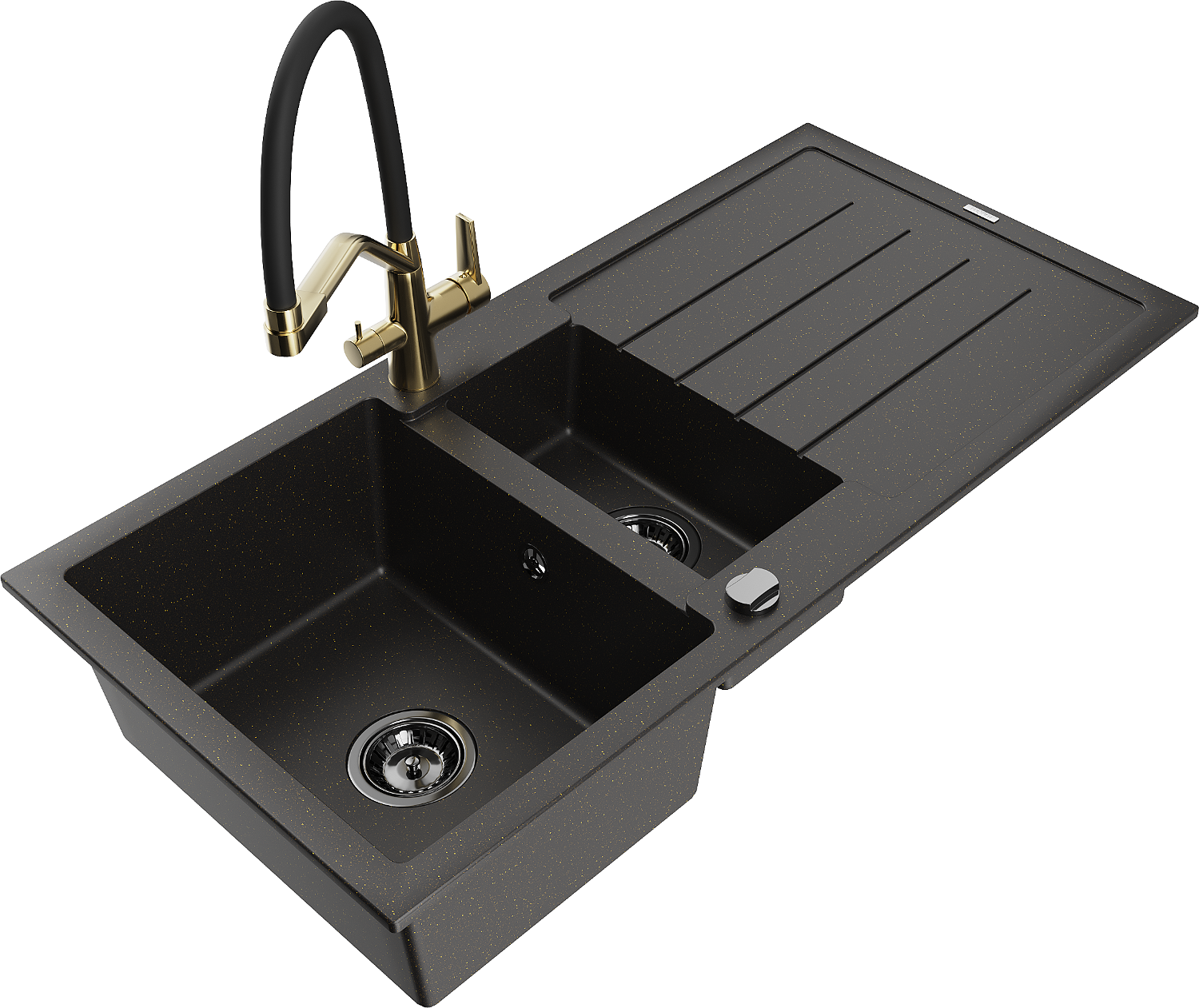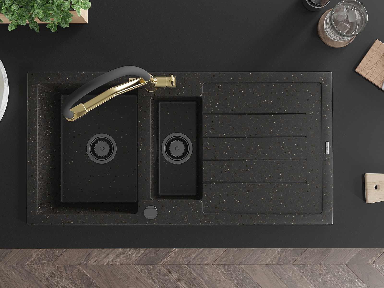 Mexen Andres granitový dřez 1,5-komorový s odkapávačem a kuchyňskou baterií Duo, černý/zlatý metalik - 6515-75-671701-57-B