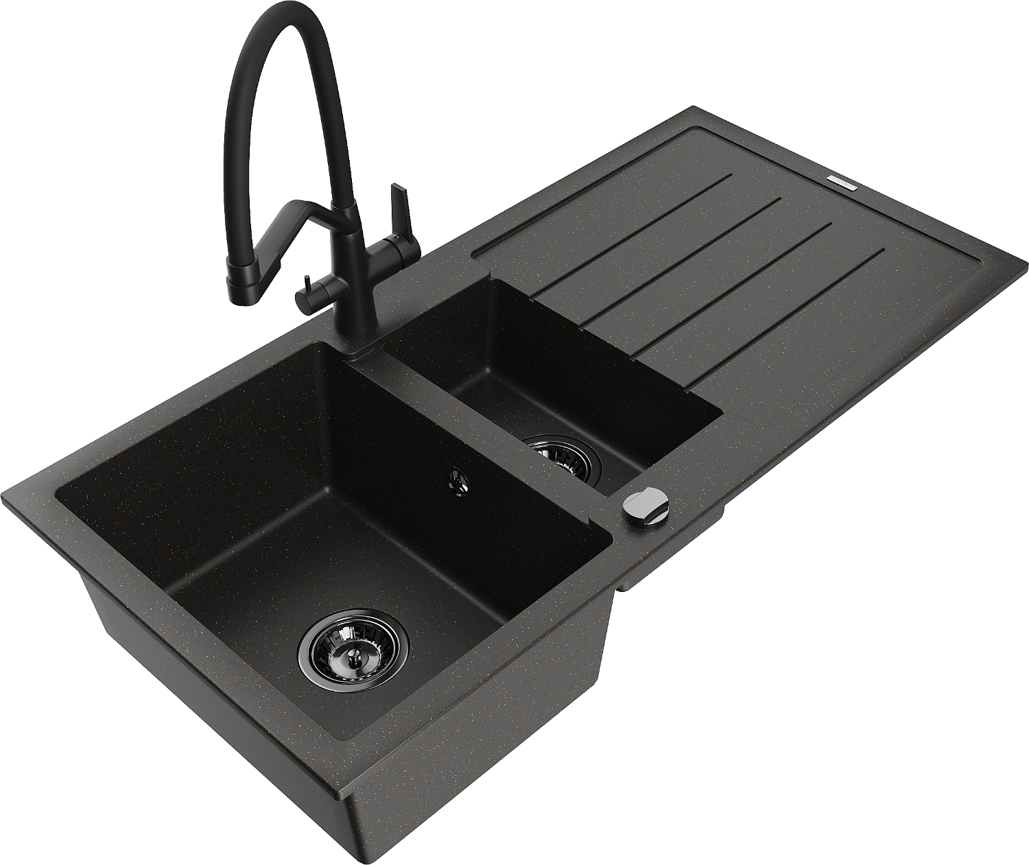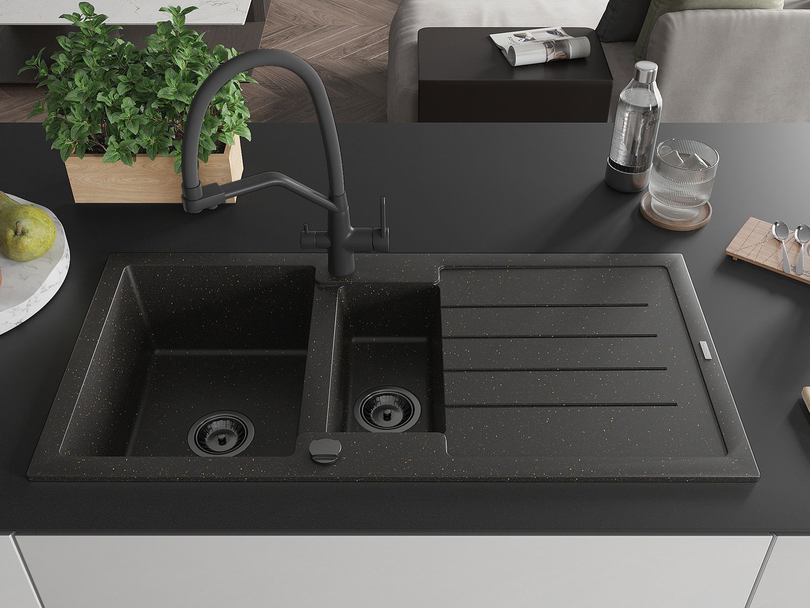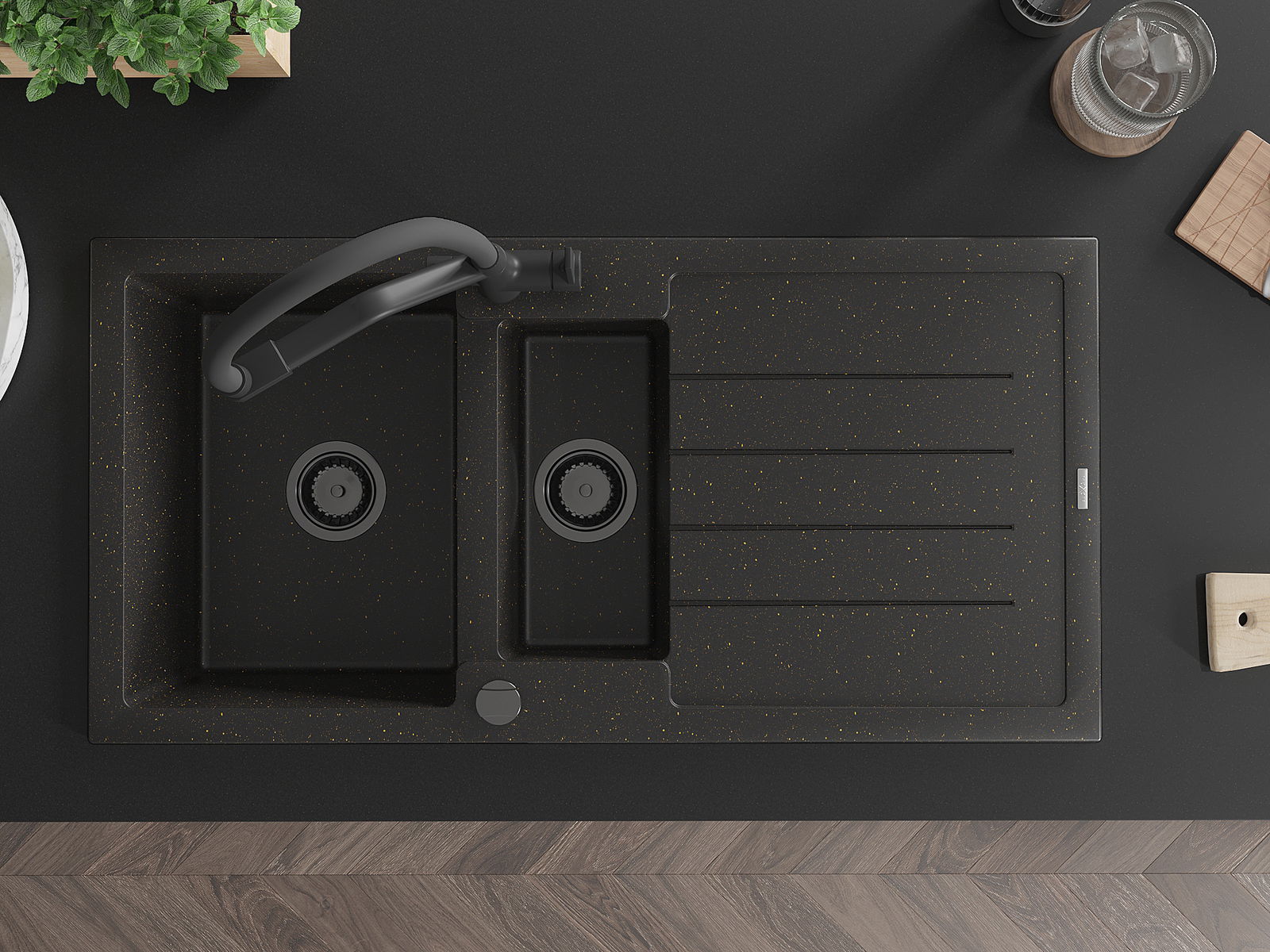 Mexen Andres granitový dřez 1,5komorový s odkapávačem a kuchyňskou baterií Duo, černý/zlatý metalik - 6515-75-671701-70-B