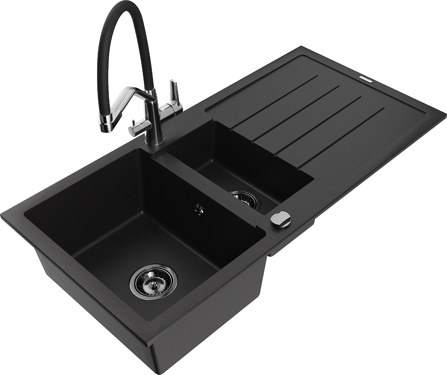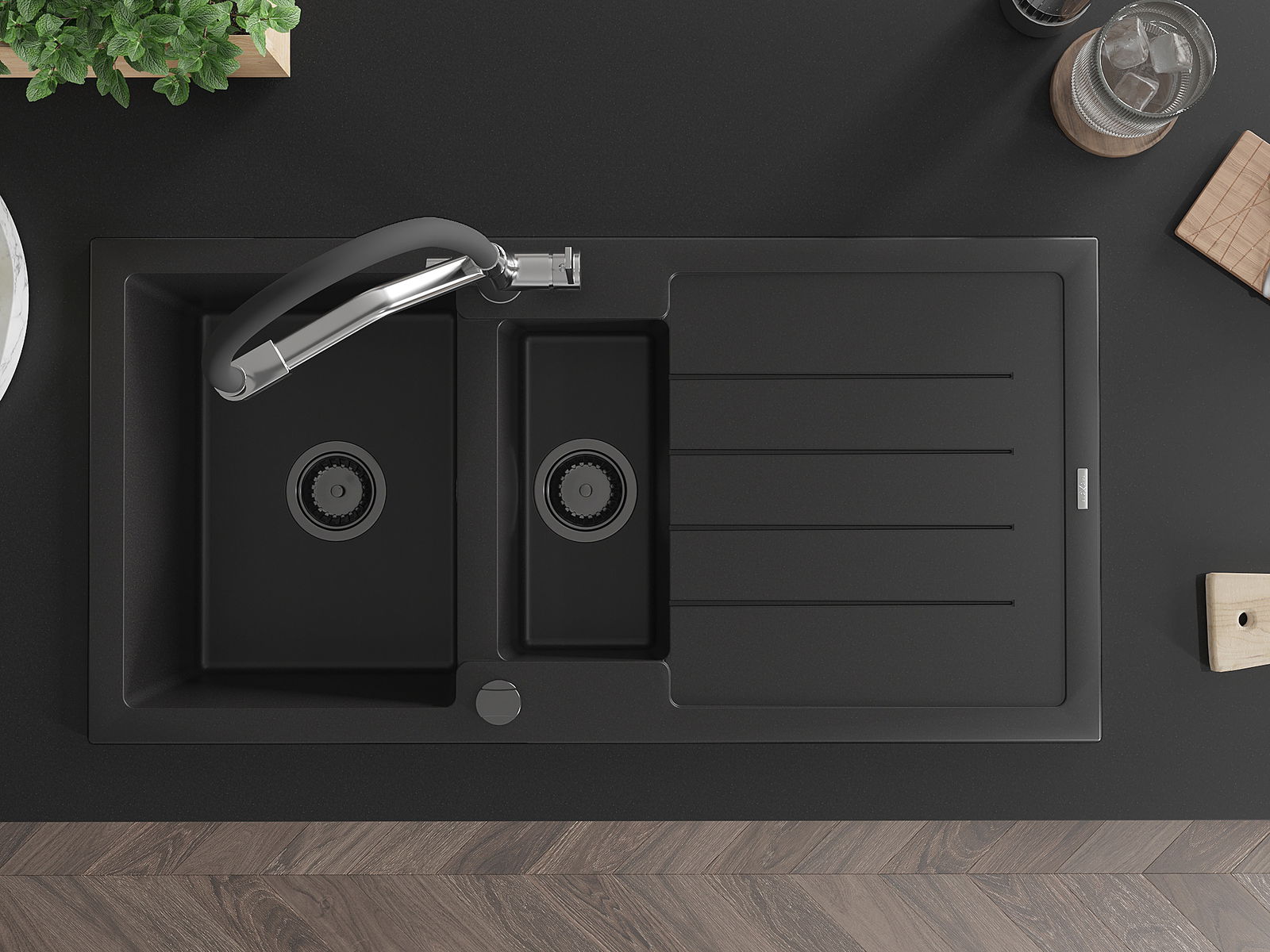 Mexen Andres granitový dřez 1,5-komorový s odkapávačem a kuchyňskou baterií Duo, černý - 6515-77-671701-07-B