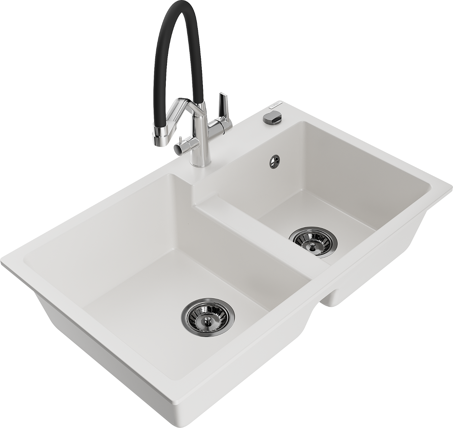 Mexen Tomas granitový dřez dvoukomorový s kuchyňskou baterií Duo, bílý - 6516-20-671701-07-B
