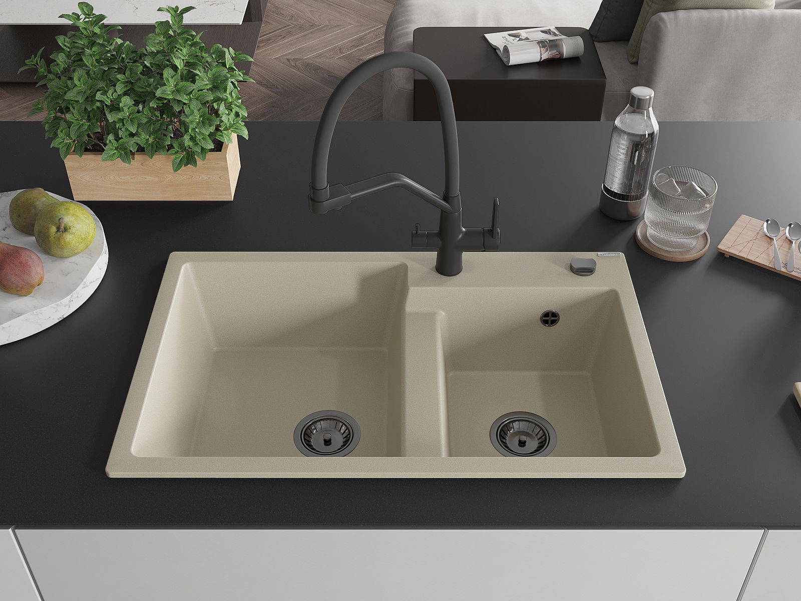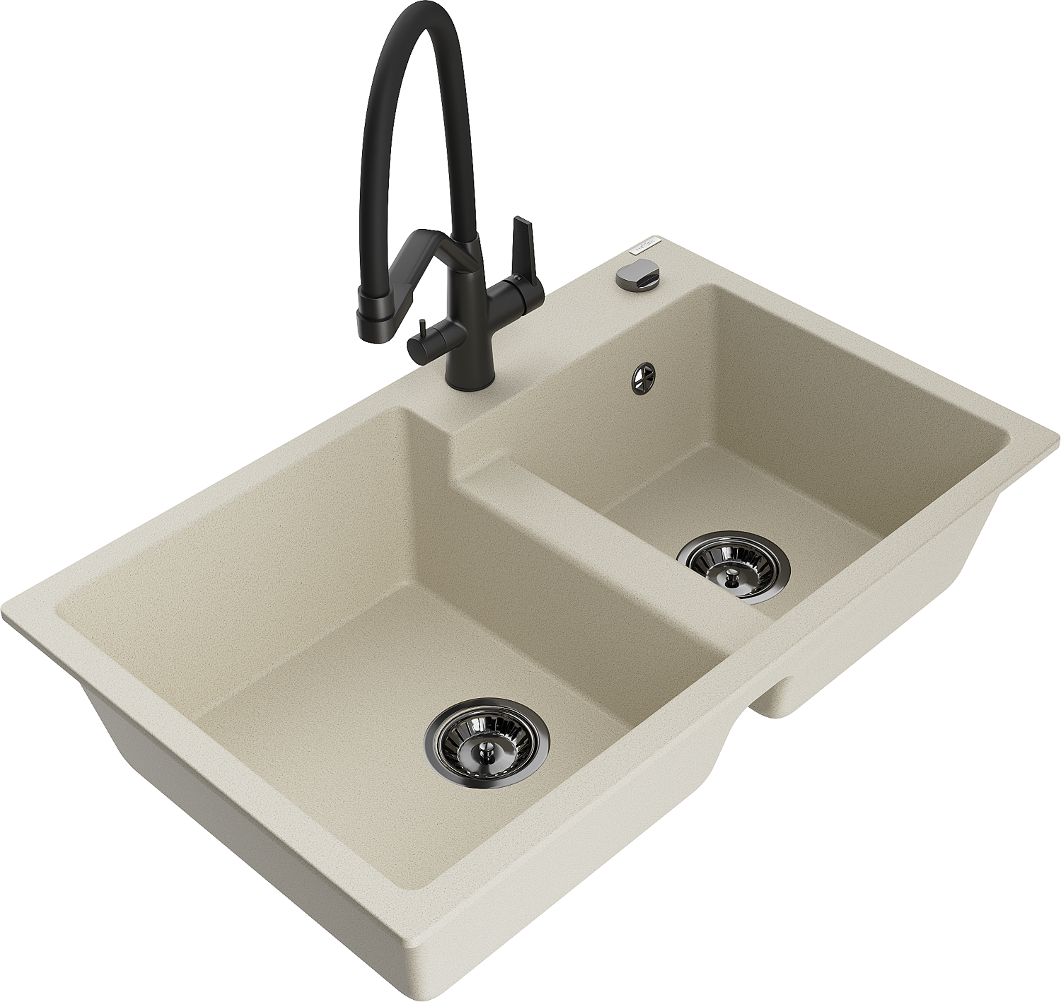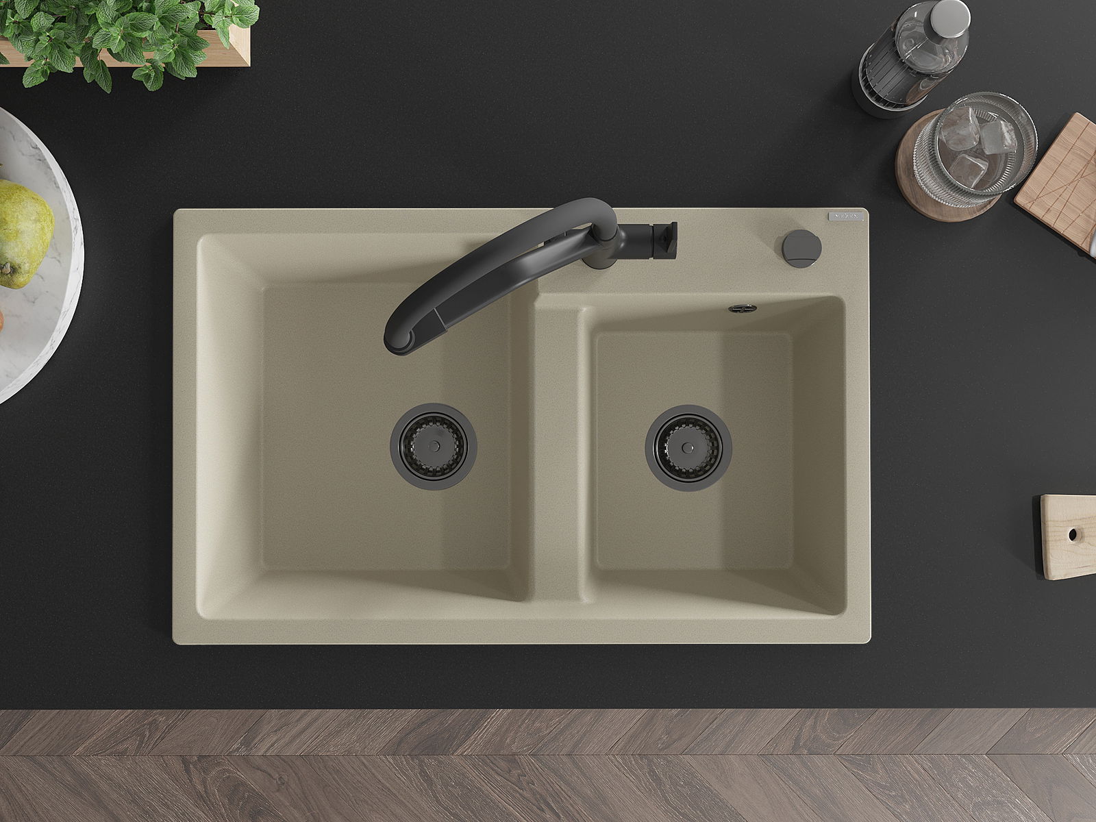 Mexen Tomas dřez granitový 2-komorový s kuchyňskou baterií Duo, béžový - 6516-69-671701-70-B