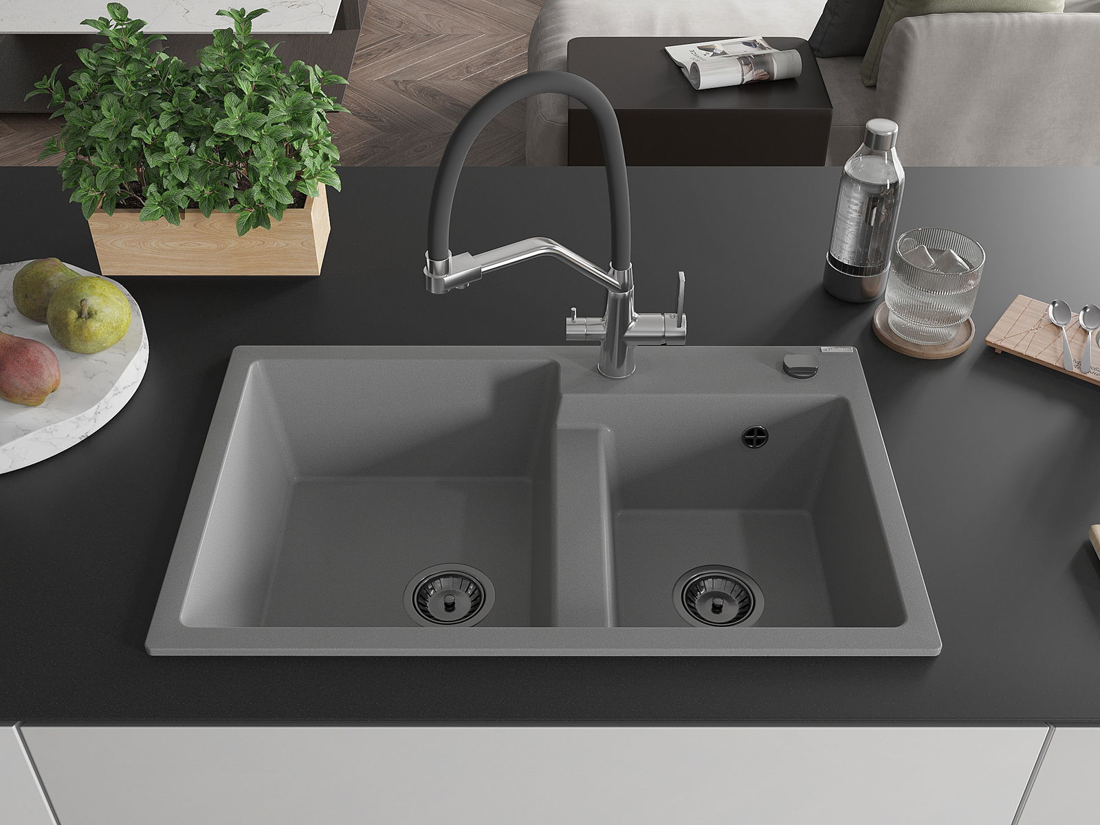 Mexen Tomas dřez granitový 2-komorový s kuchyňskou baterií Duo, šedý - 6516-71-671701-07-B