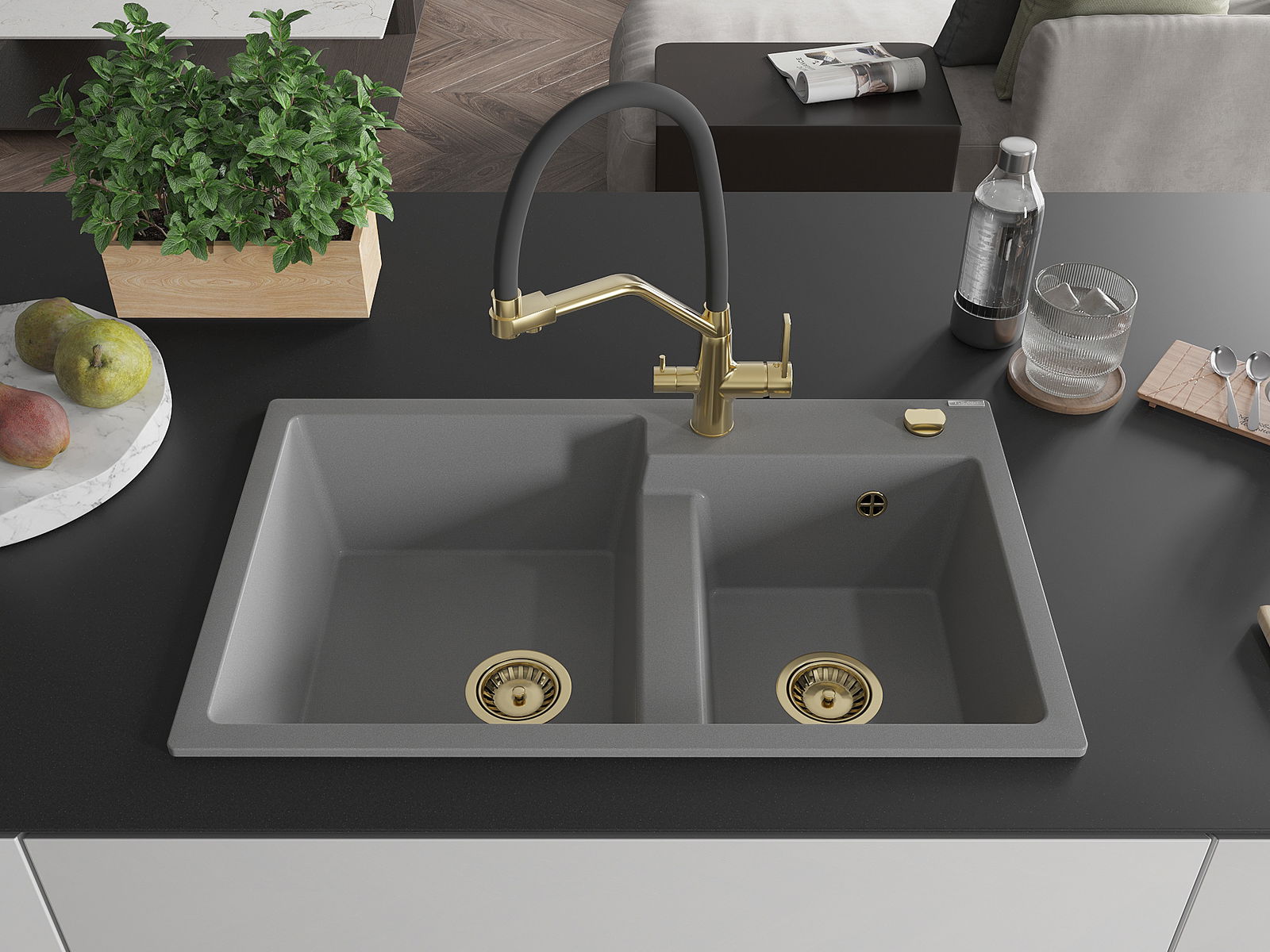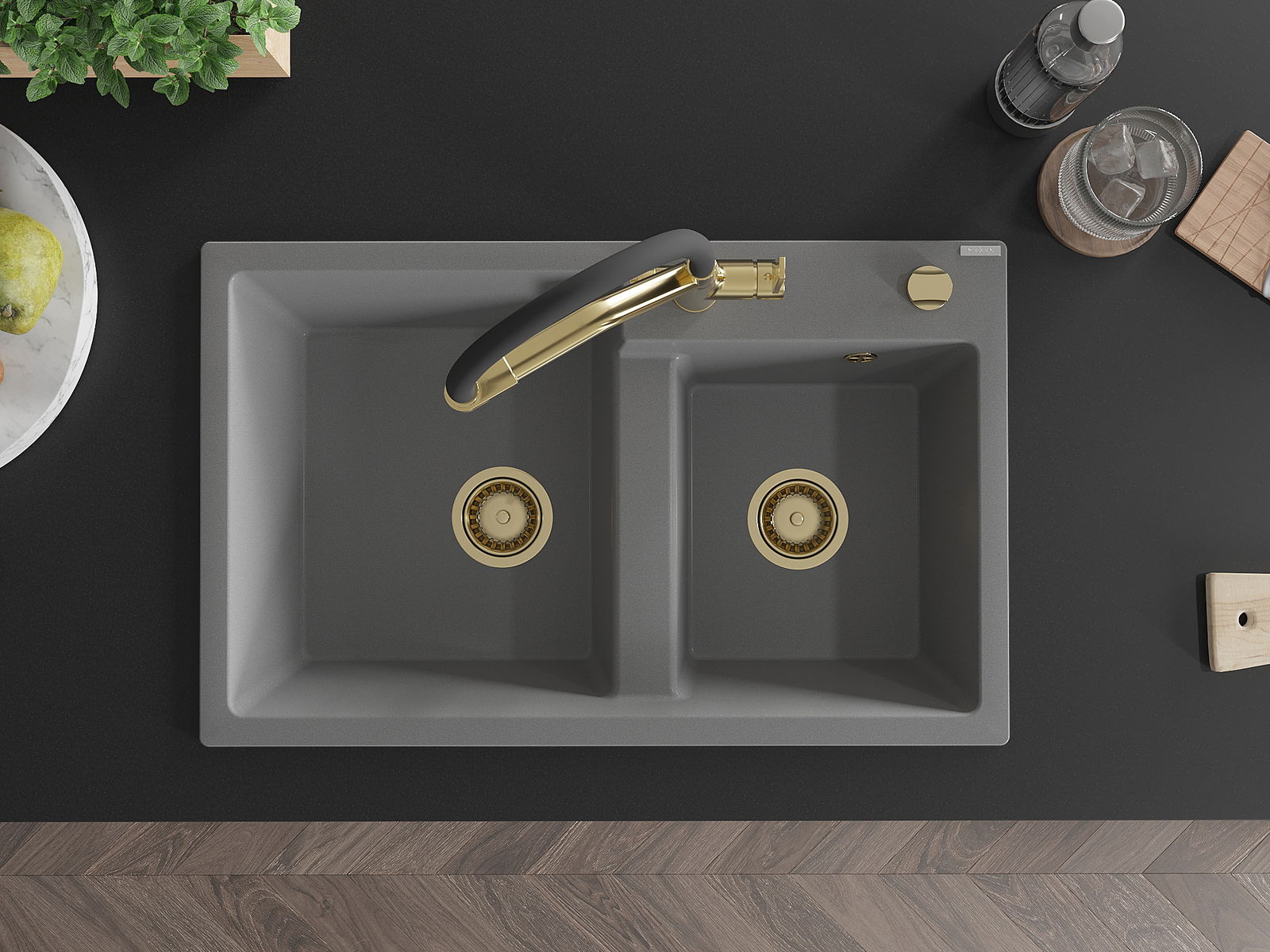 Mexen Tomas dvoukomorový granitový dřez s kuchyňskou baterií Duo, šedý - 6516-71-671701-57-G