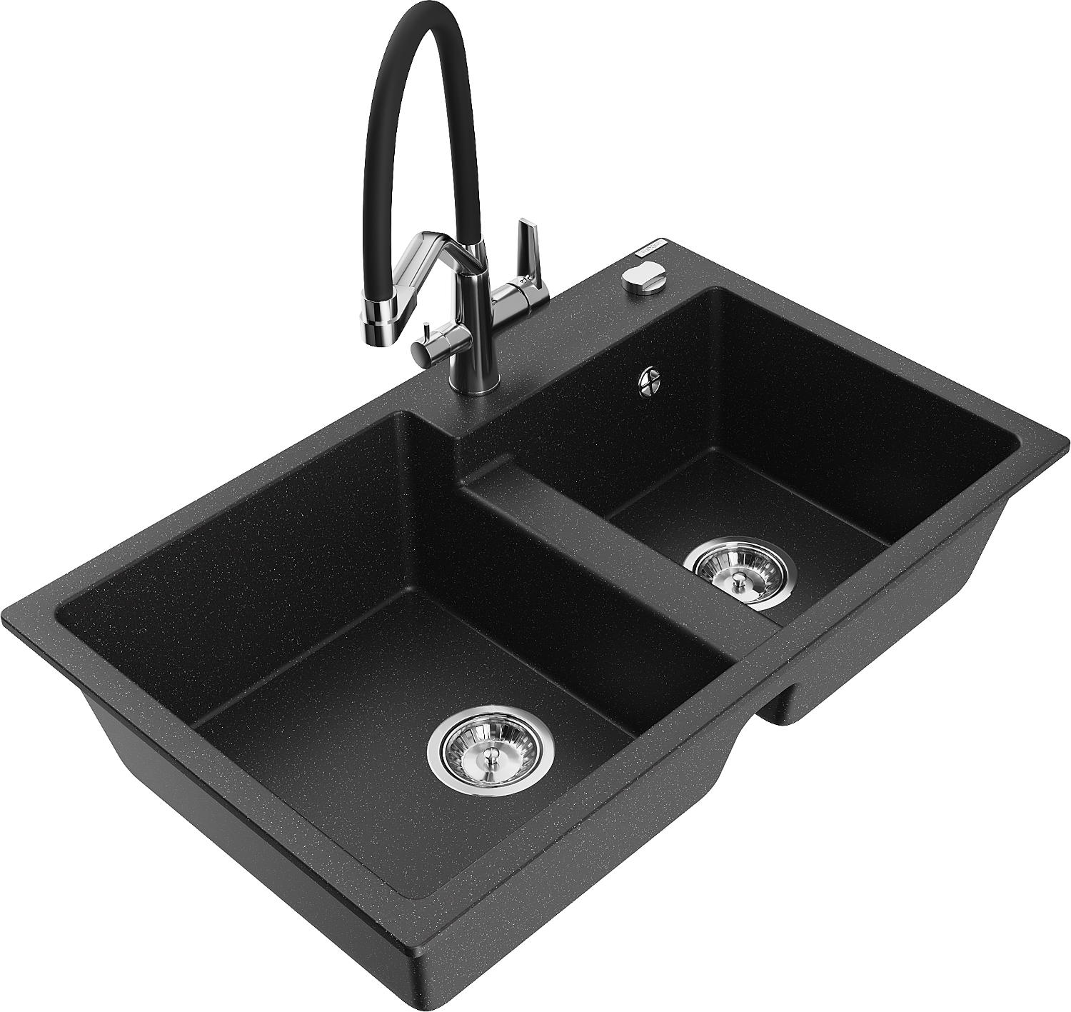 Mexen Tomas dřez granitový 2-komorový s kuchyňskou baterií Duo, černý/stříbrný metalik - 6516-73-671701-07