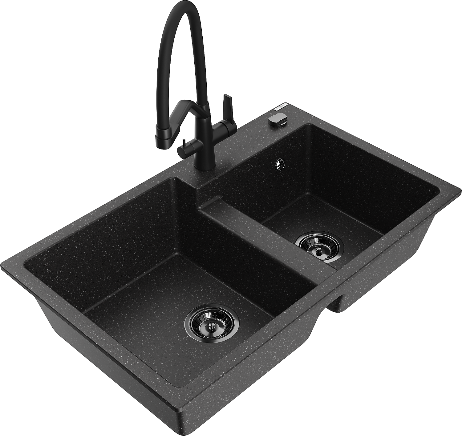 Mexen Tomas dvoukomorový granitový dřez s kuchyňskou baterií Duo, černý/stříbrný metalic - 6516-73-671701-70-B