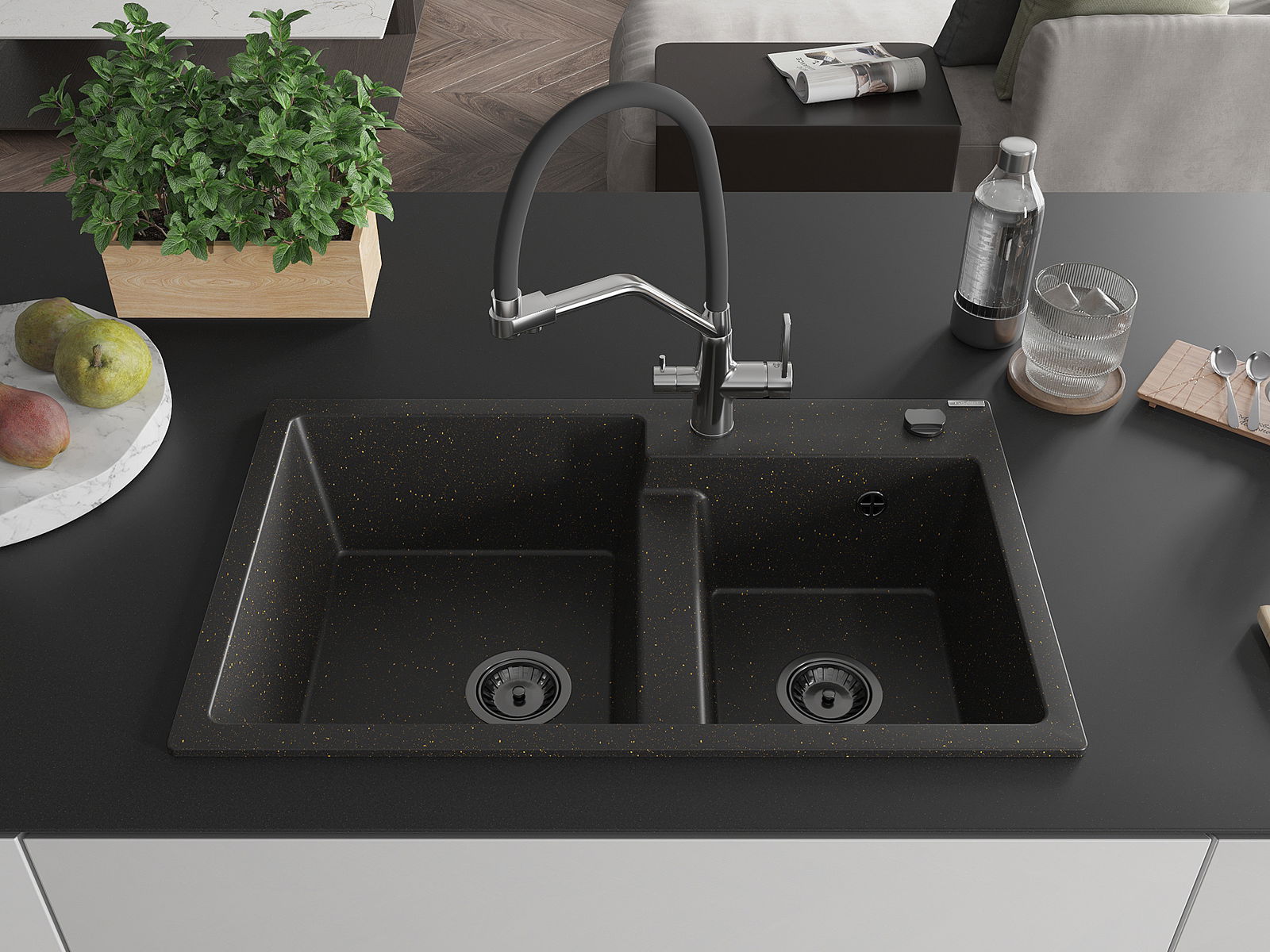 Mexen Tomas granitový dřez dvoukomorový s kuchyňskou baterií Duo, černý/zlatý metalik - 6516-75-671701-07-B
