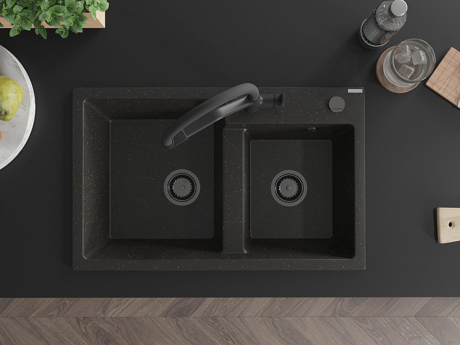 Mexen Tomas granitový dřez 2-komorový s kuchyňskou baterií Duo, černý/zlatý metalik - 6516-75-671701-70-B