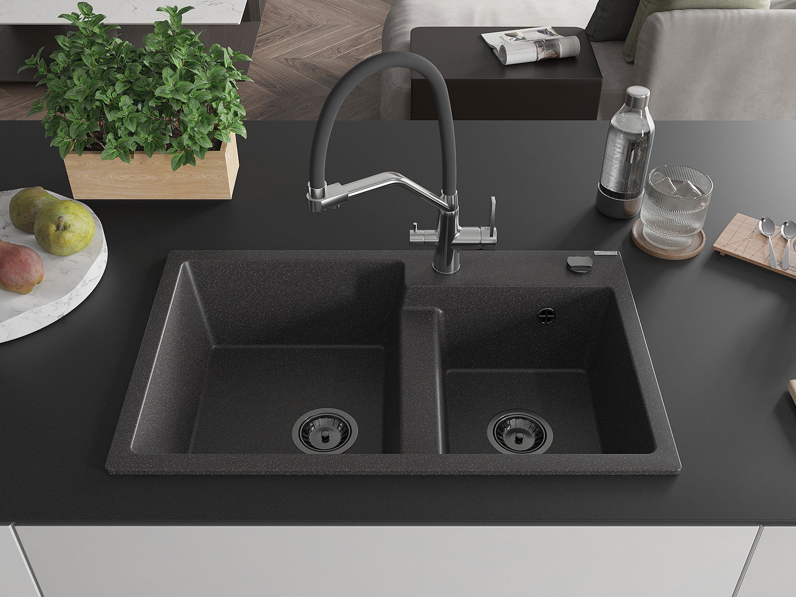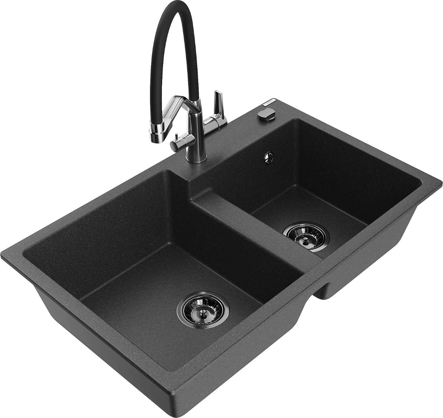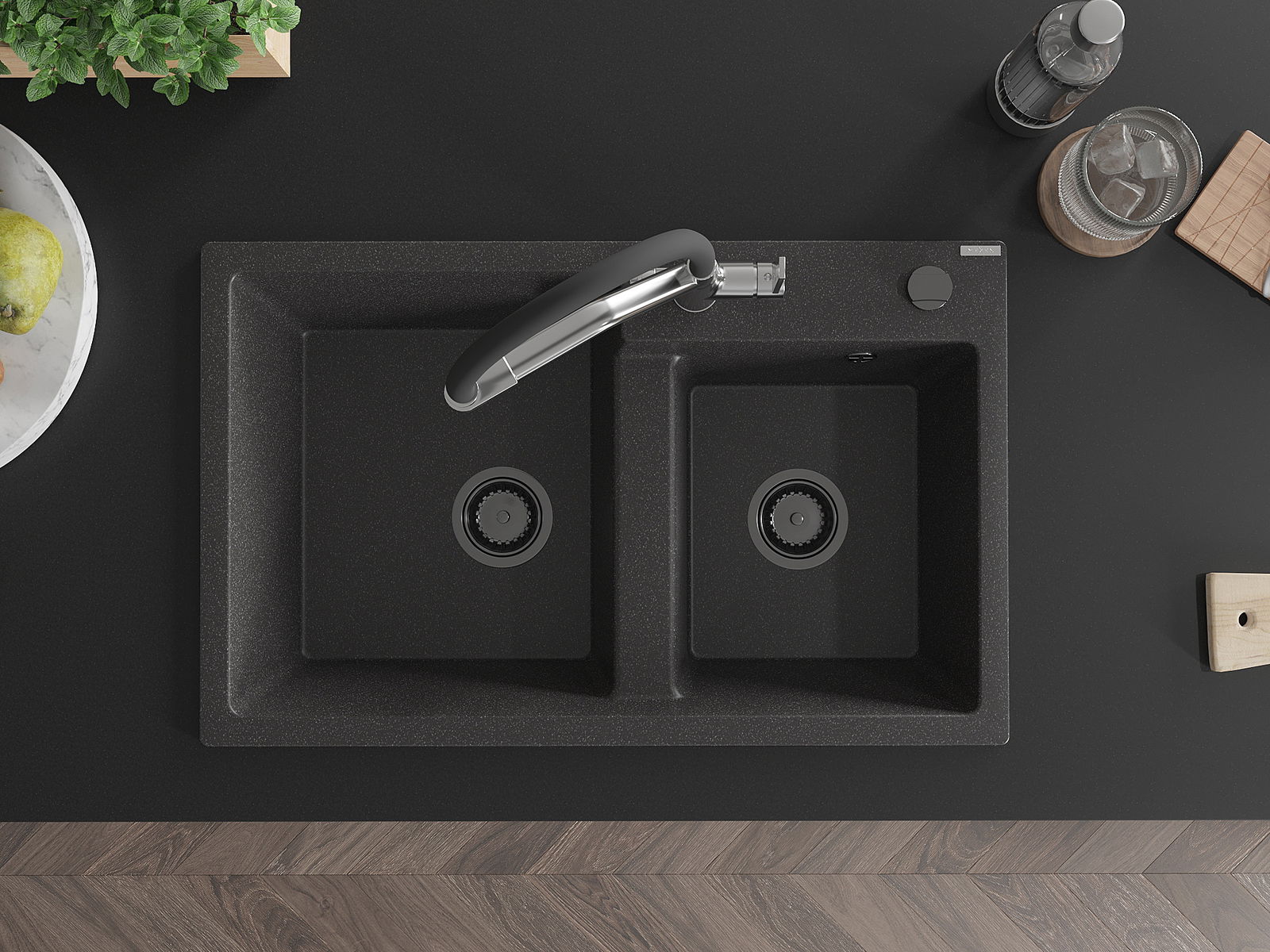 Mexen Tomas dřez granitový 2-komorový s kuchyňskou baterií Duo, černý skvrnitý - 6516-76-671701-07-B