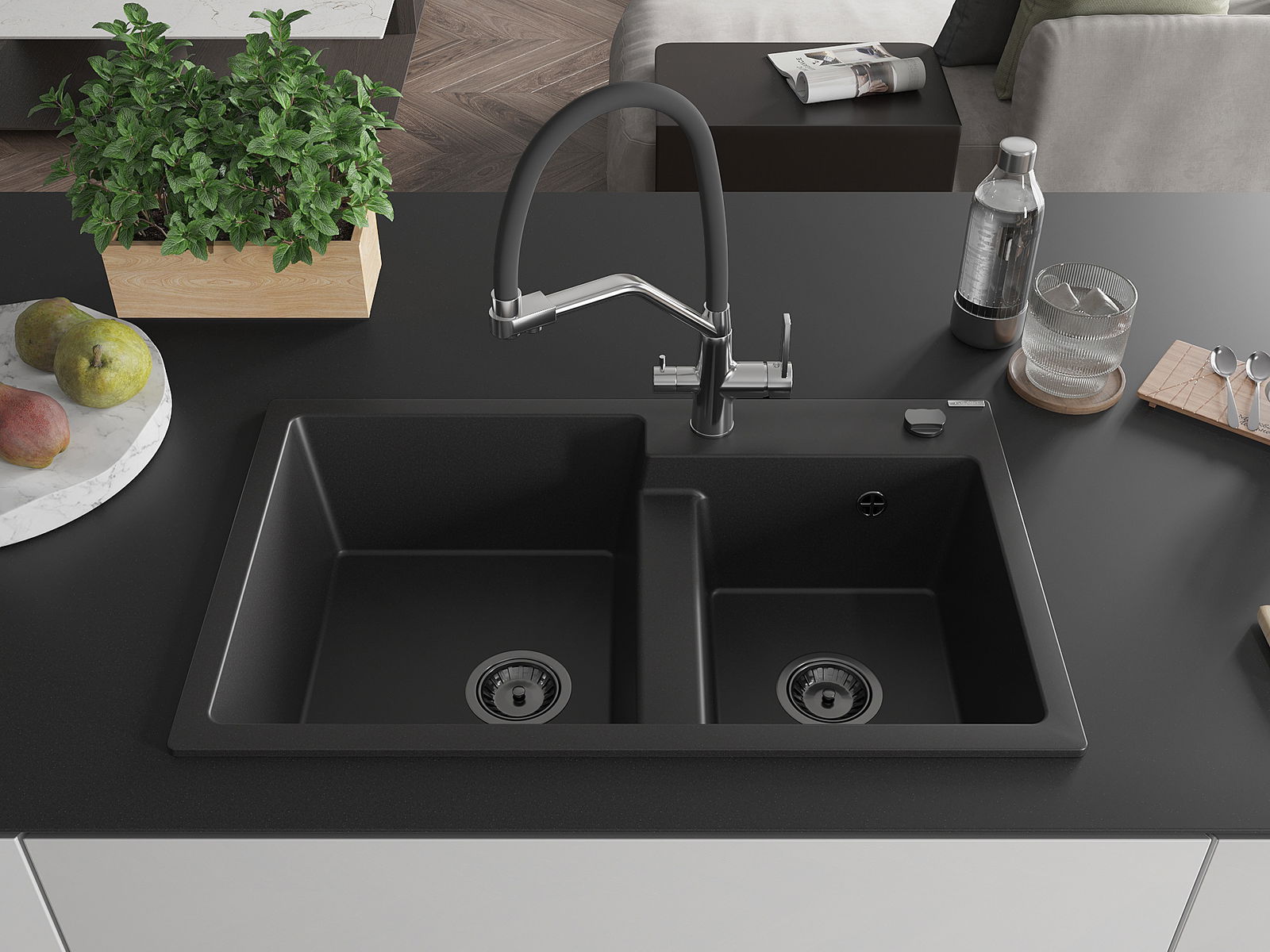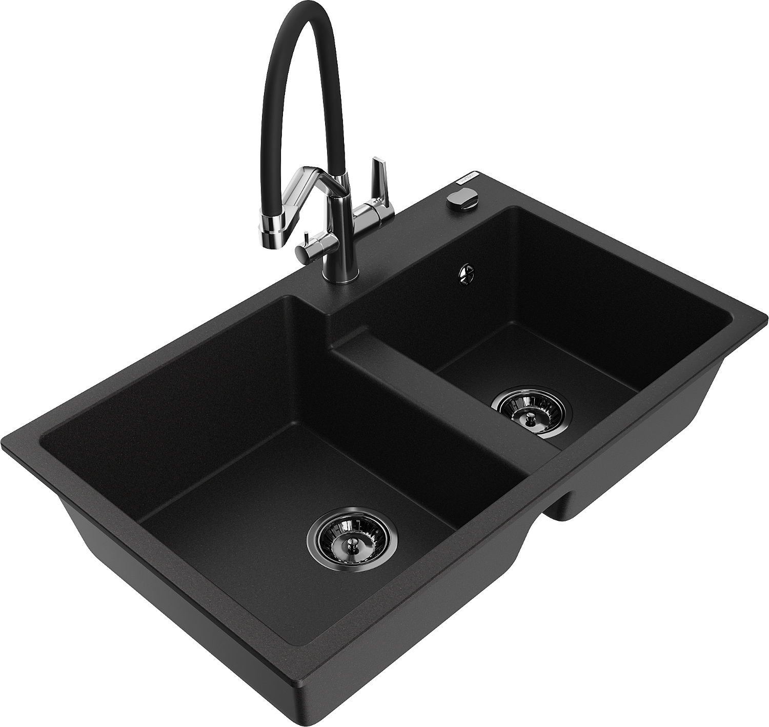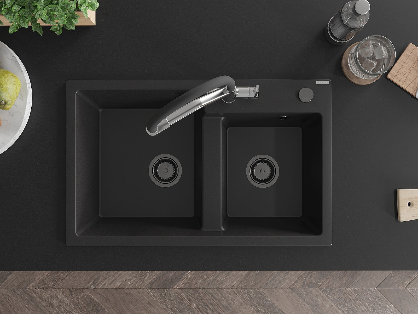 Mexen Tomas žulový dřez 2-komorový s kuchyňskou baterií Duo, černý - 6516-77-671701-07-B