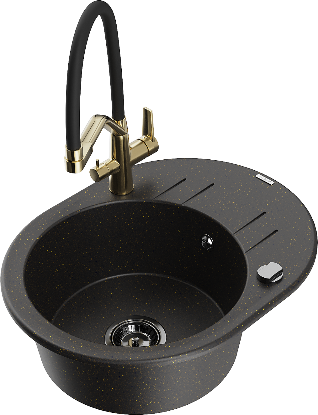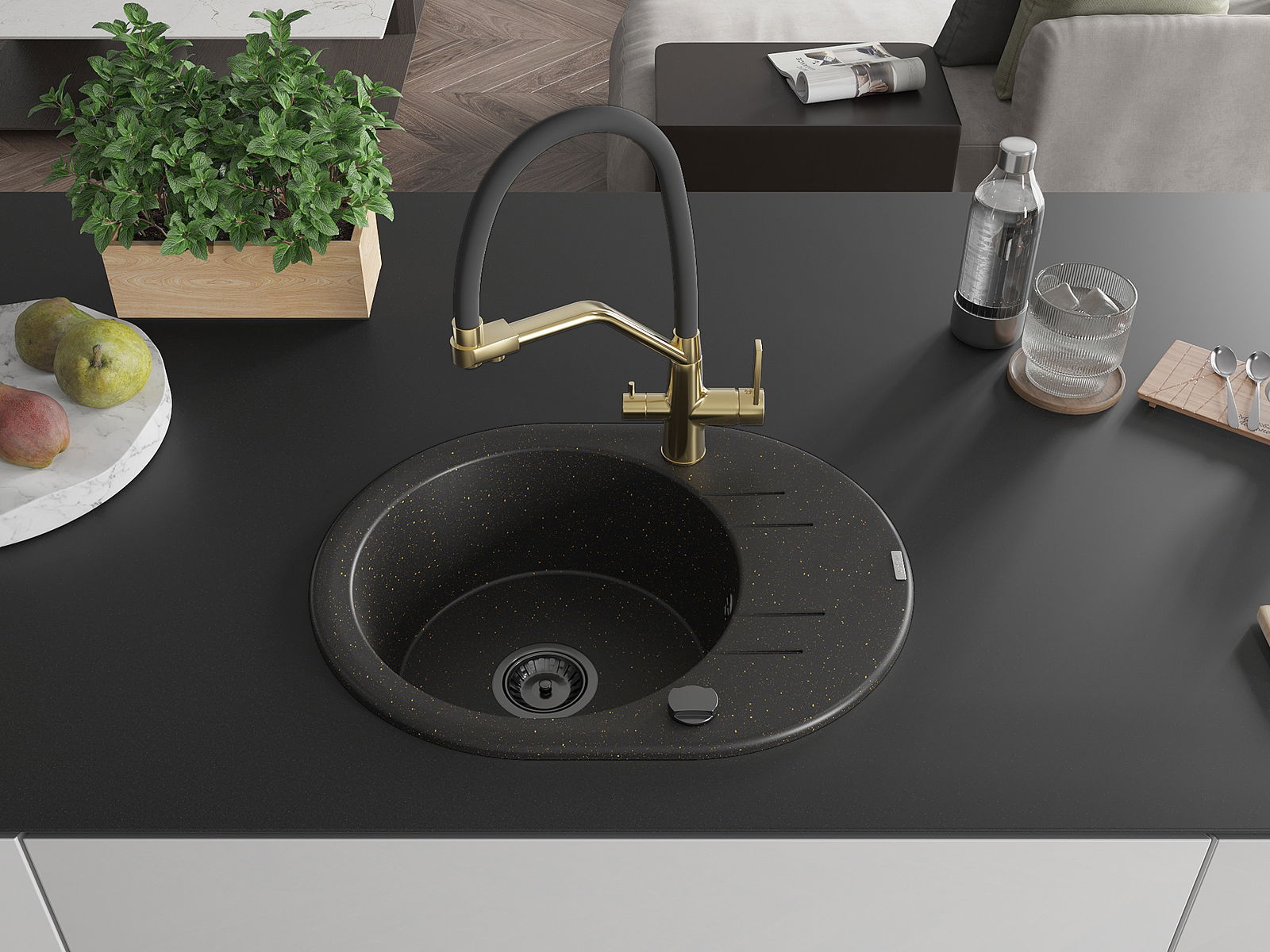 Mexen Kevin granitový dřez 1-komorový s kuchyňskou baterií Duo, černý/zlatý metalický - 6517-75-671701-57-B