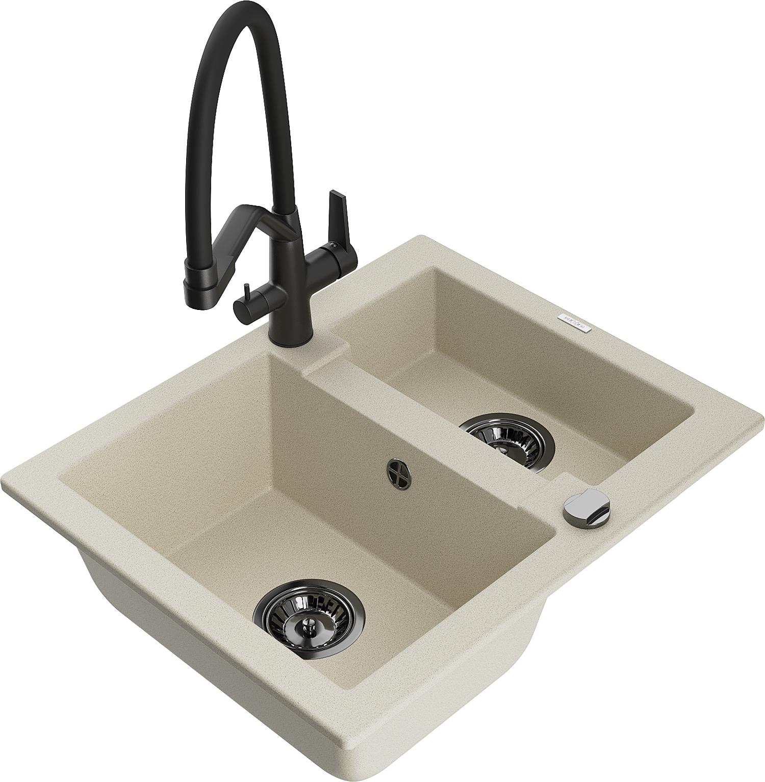 Mexen Carlos žulový dřez 1,5-komorový s kuchyňskou baterií Duo, béžový - 6518-69-671701-70-B